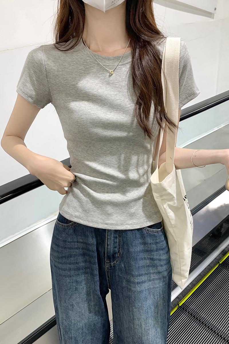실제 가격#기본 스타일 전면 프론트 어깨 단락 티셔츠 여성용 2025 여름 새로운 다목적 라운드 목 허리 껴안는 짧은 탑
