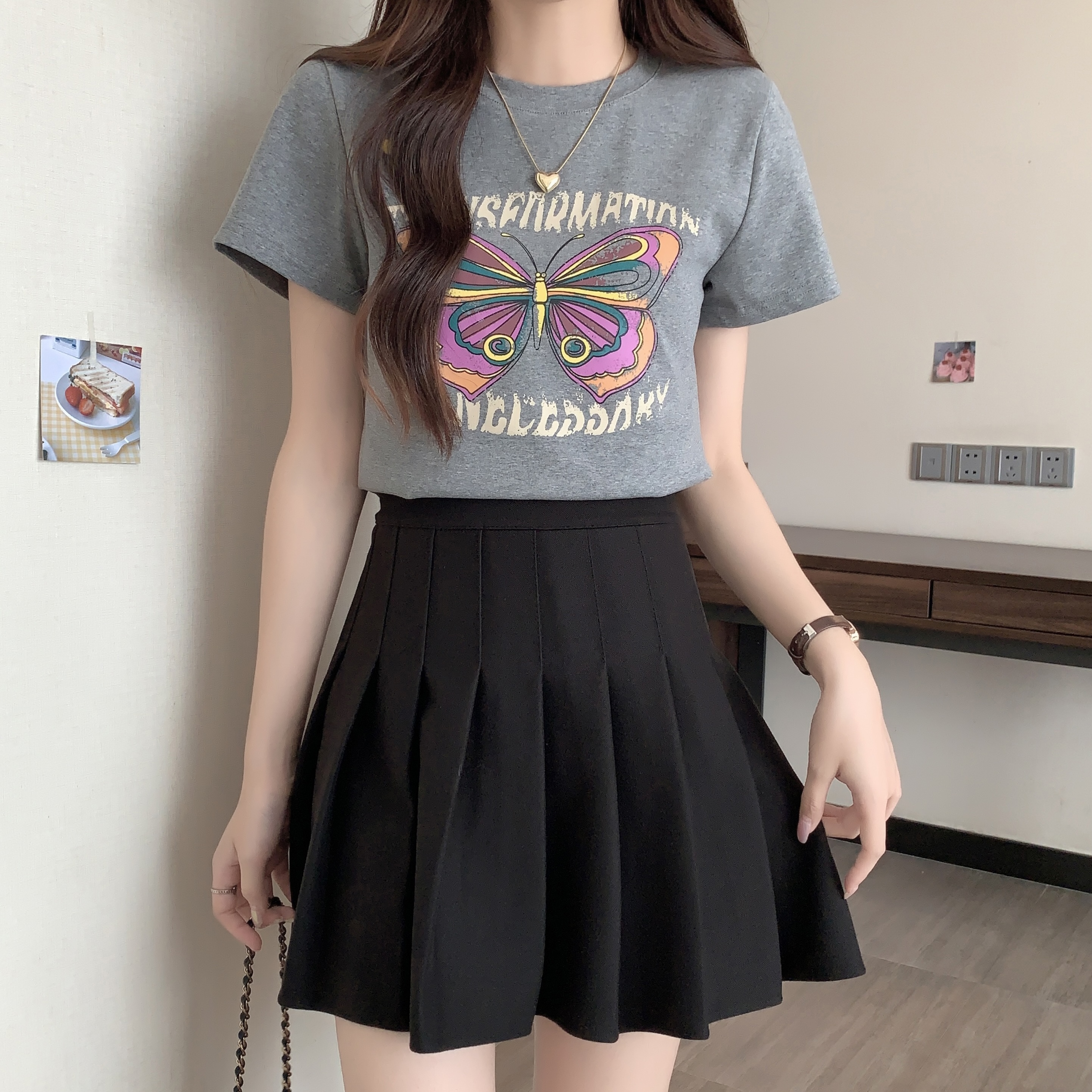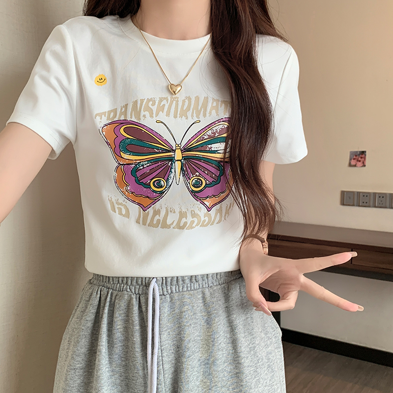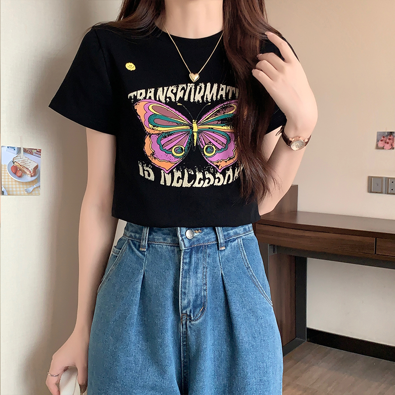 실제 가격 미국 레트로 나비 프린트 프론트 어깨 짧은 슬립 티셔츠 여성 여름 202 새로운 둥근 목 느슨한 탑