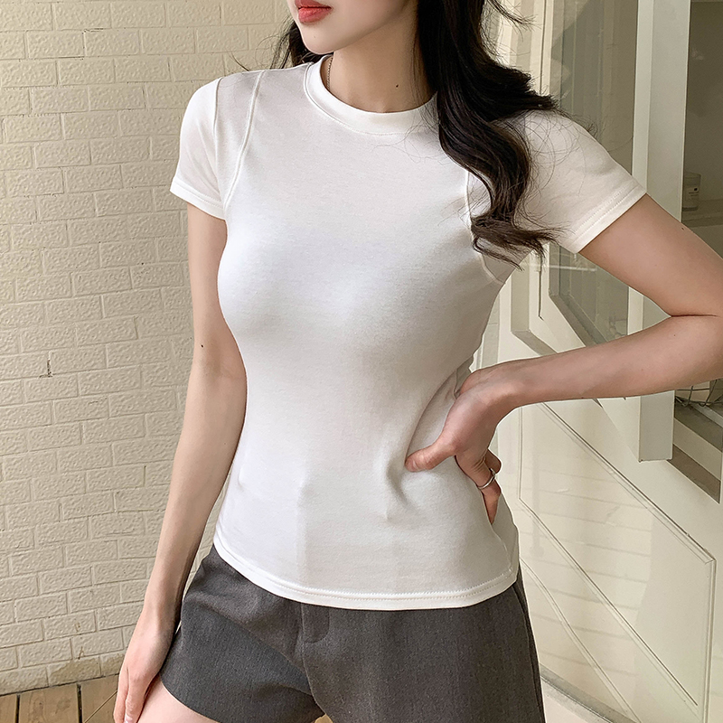 실제 샷 및 실제 가격 #라인 압력 전면 어깨 어깨 단락 티셔츠 여성용 2025 새로운 디자인 다용다 꽉 끼는 슬림 둥근 목 상단