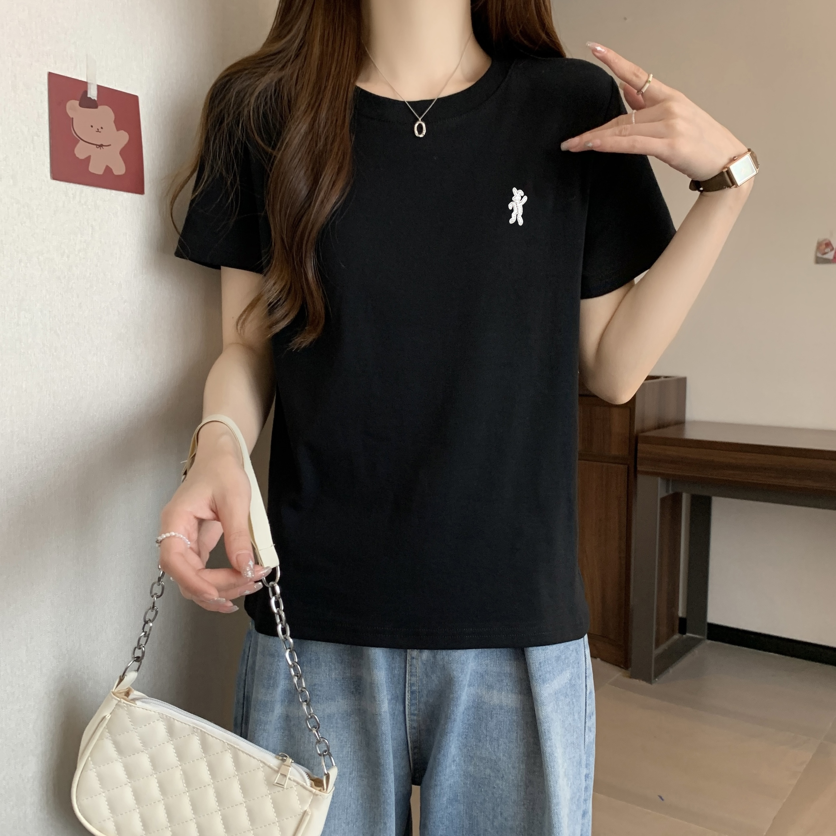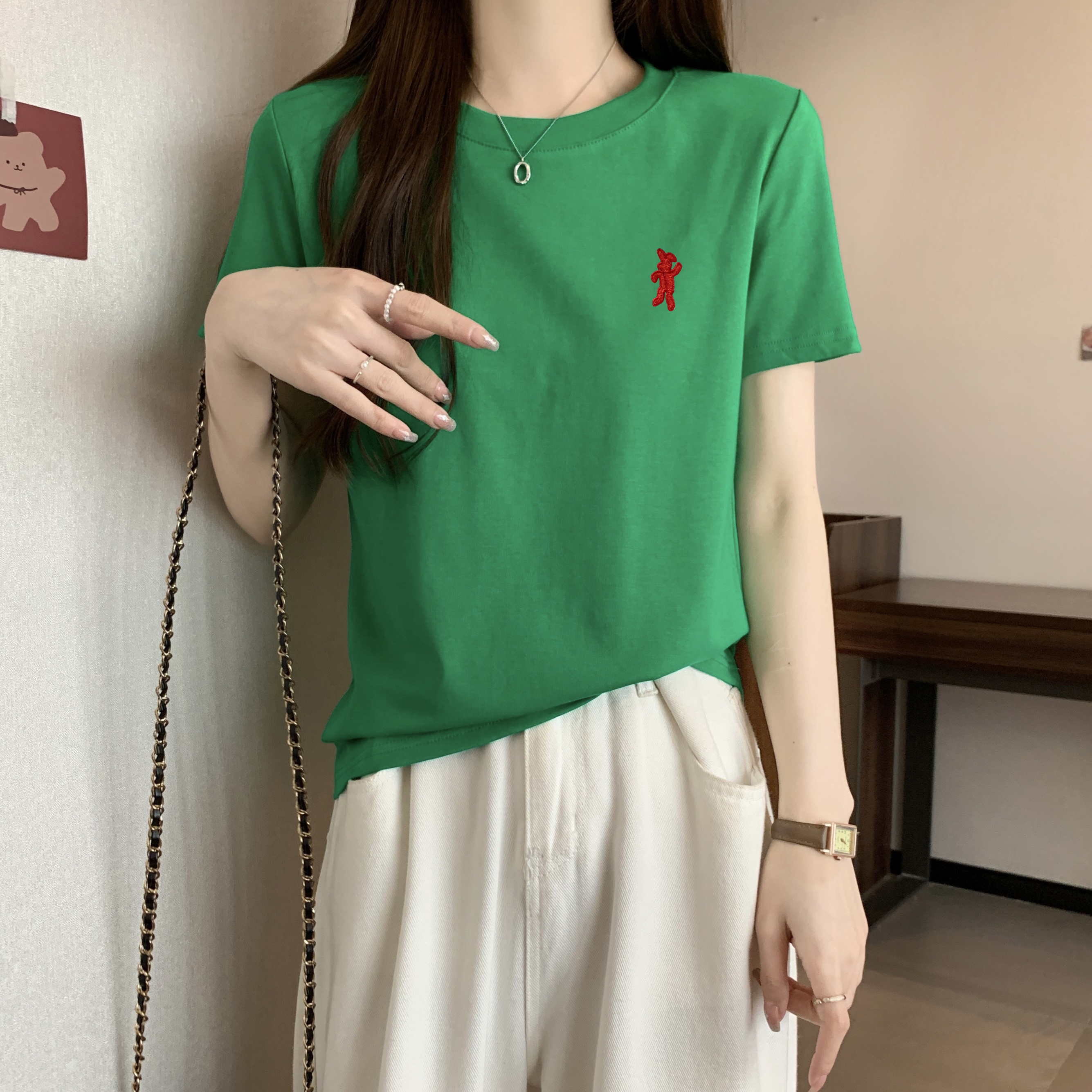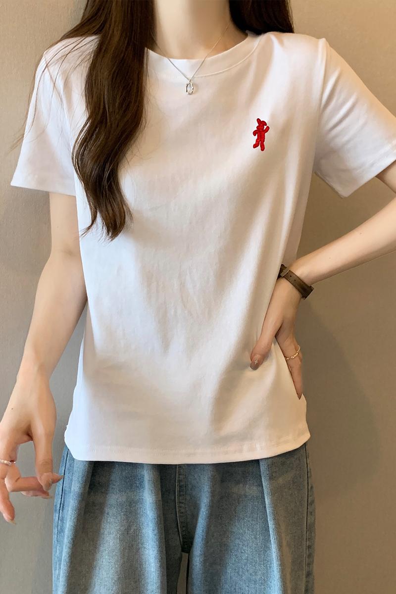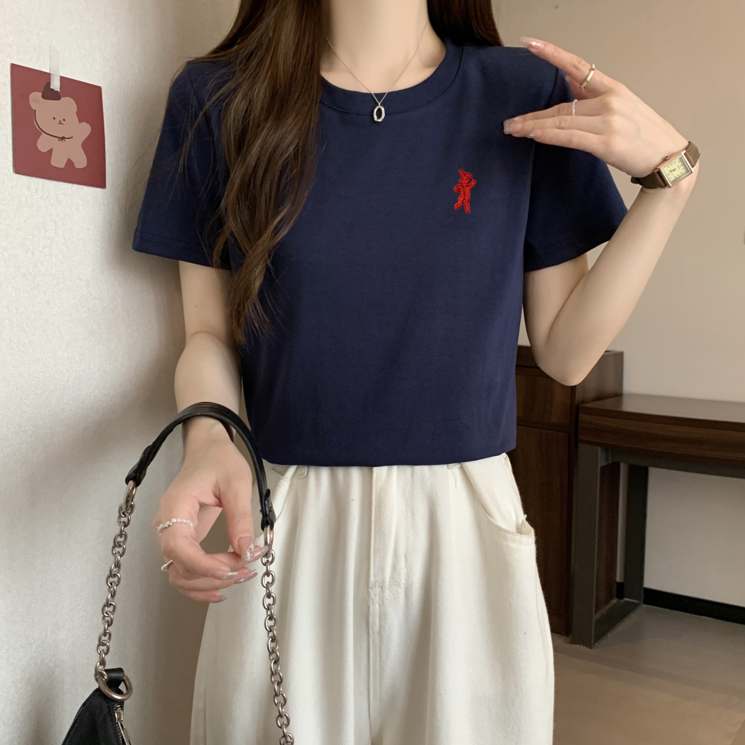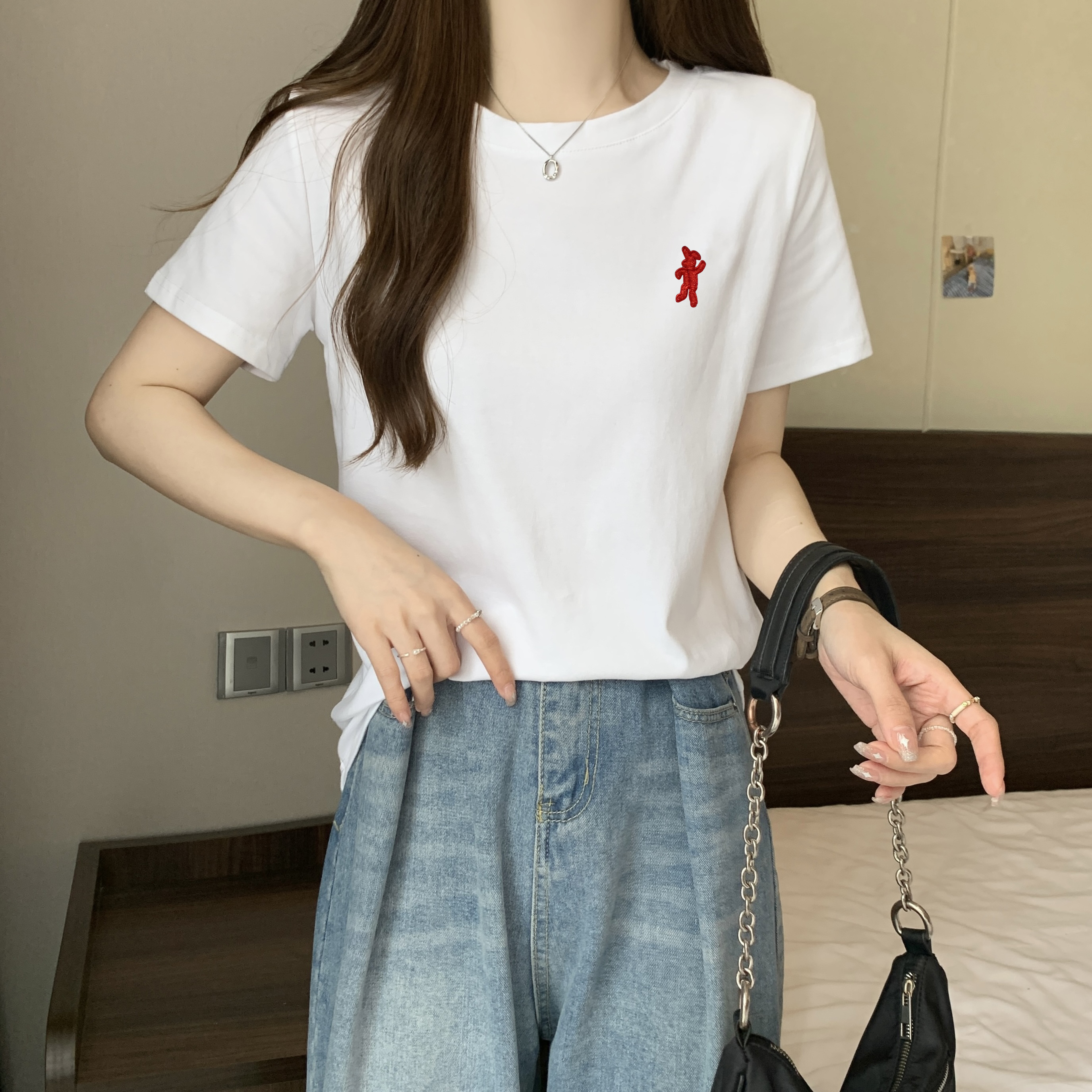 여성의 여름을위한 실제 빨간 자수 단축 티셔츠 2025 새로운 반팔 티셔츠 캐주얼 느슨한 다목적 탑