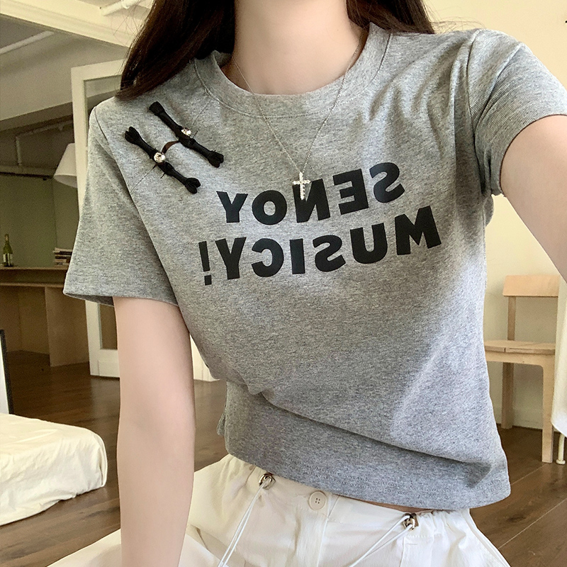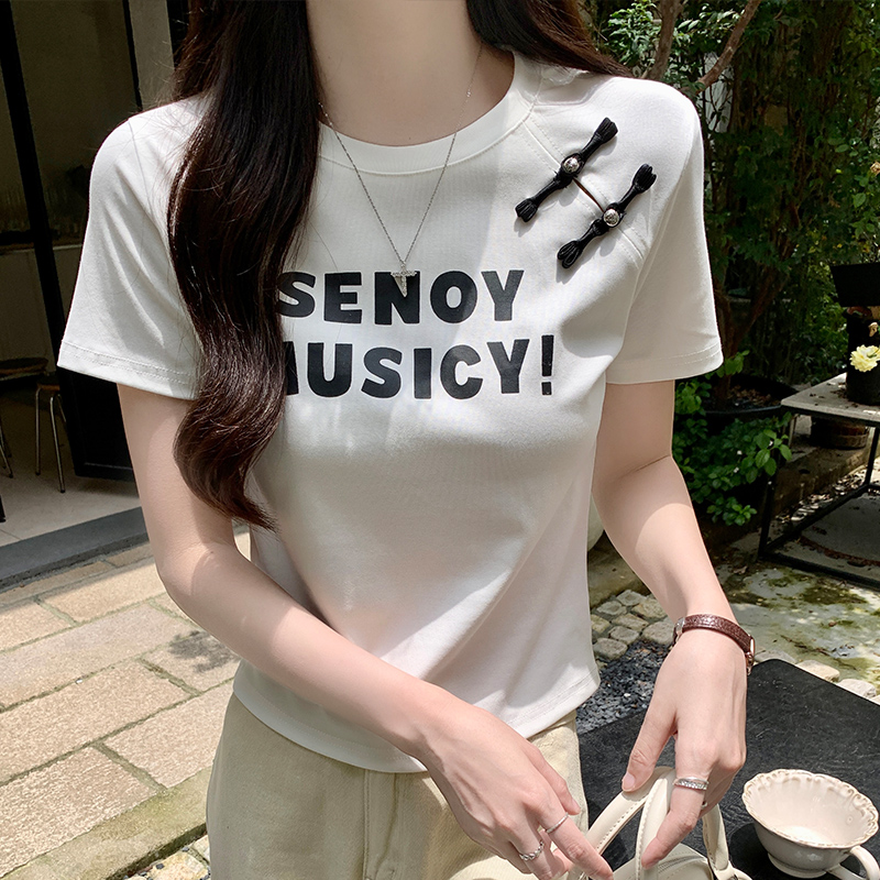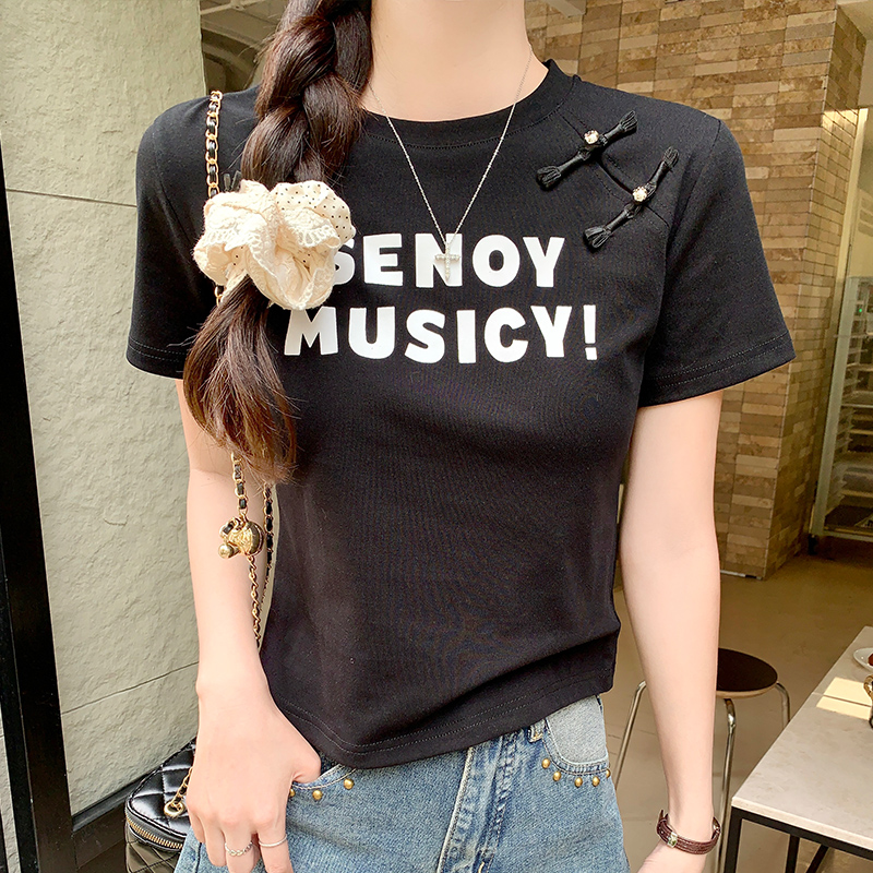 실제 가격#스윙 플레이트 버튼 어깨 어깨 단락 티셔츠 여성 여름 2025 새로운 디자인 틈새 인쇄 짧은 상단