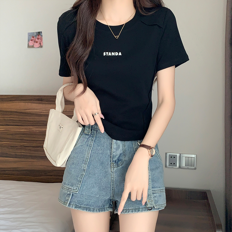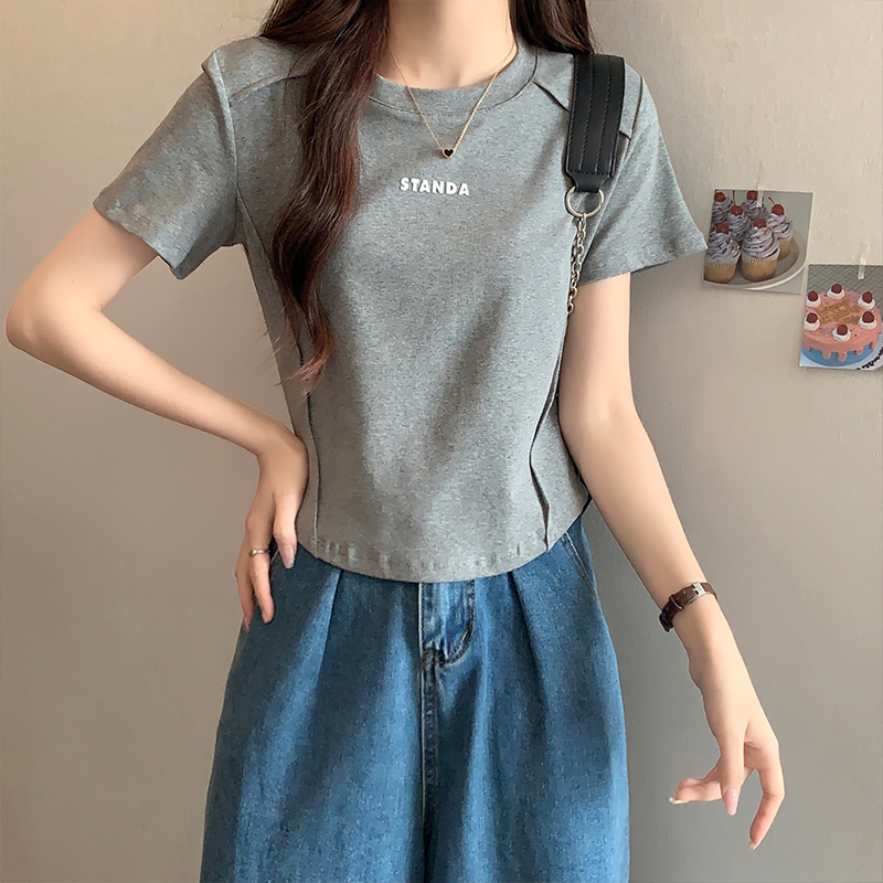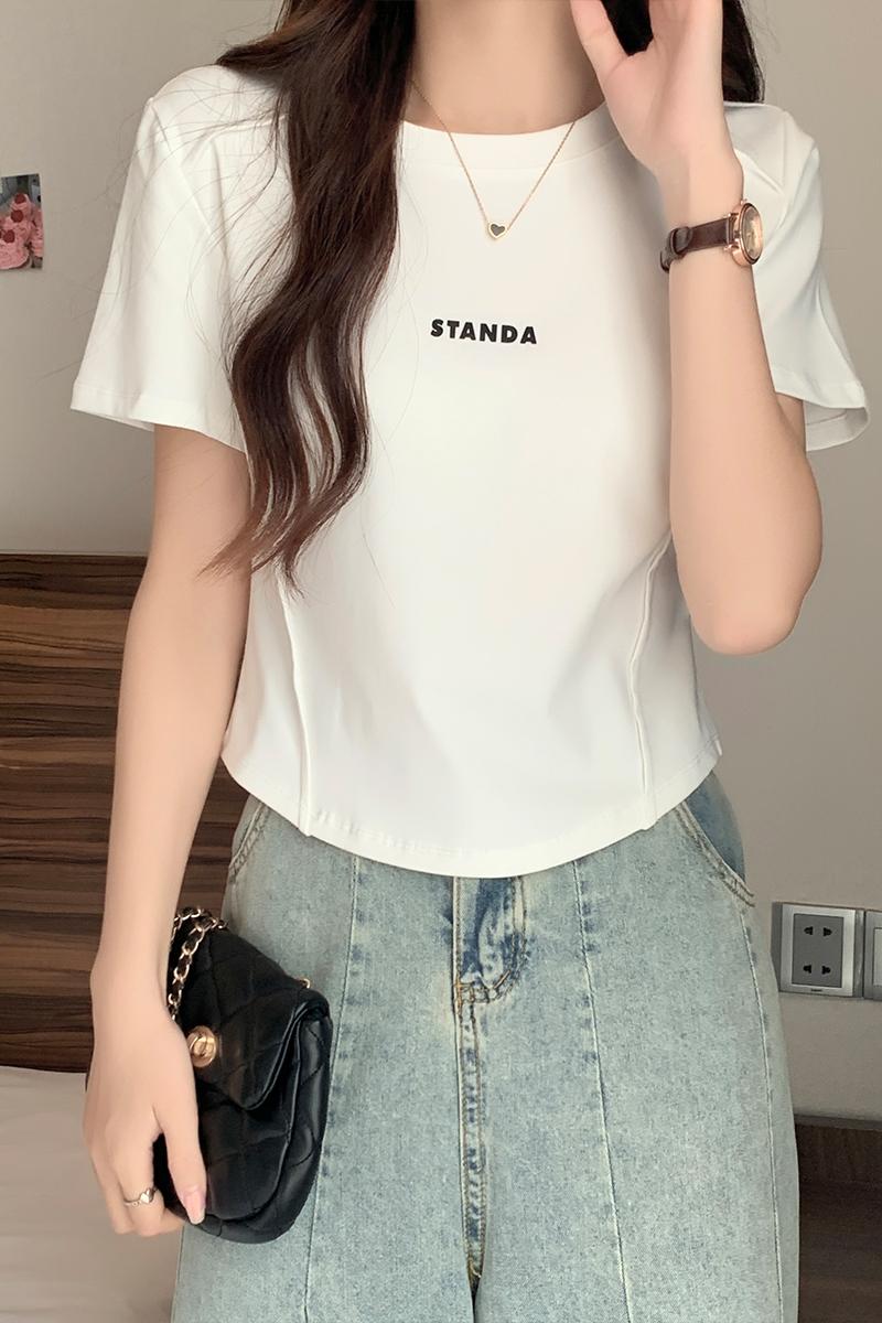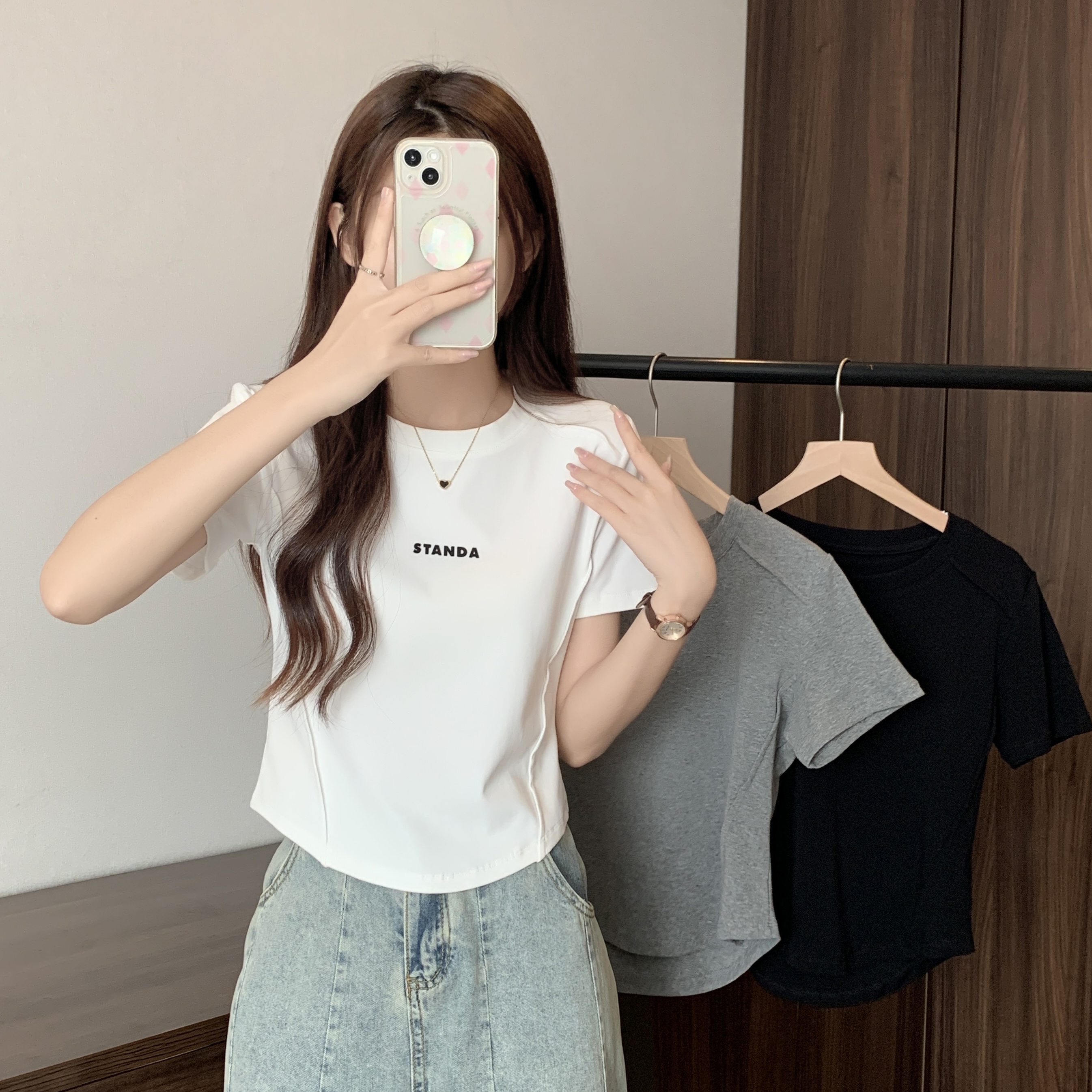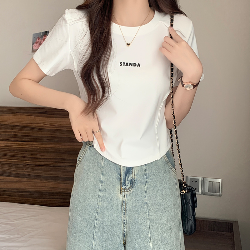 여성의 여름 디자인을위한 실제 흰색 전면 숄더 짧은 슬릿 티셔츠 틈새 틈새 시장 작은 ​​물고기 뼈 짧은 탑