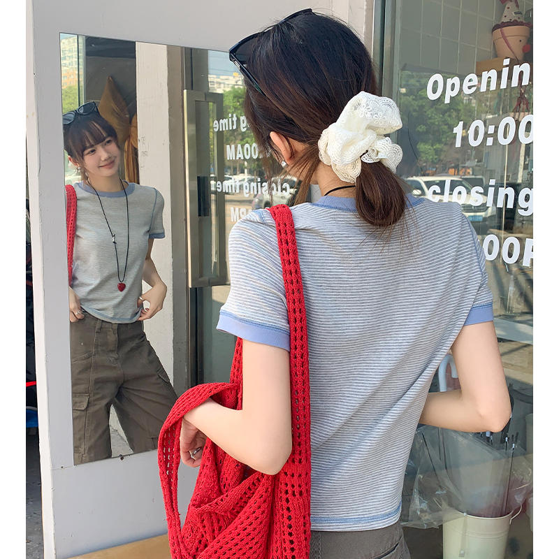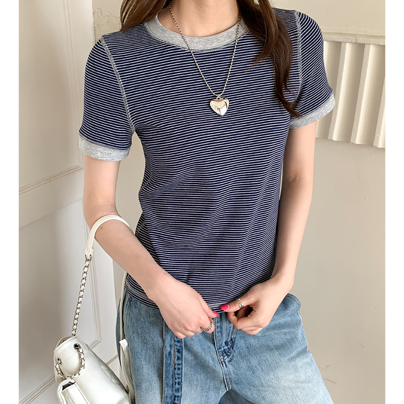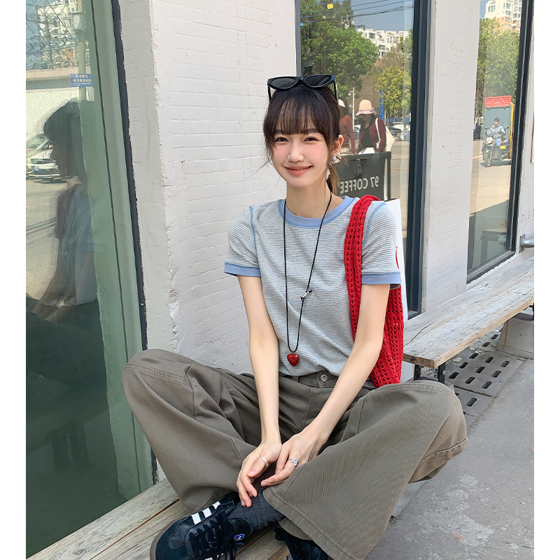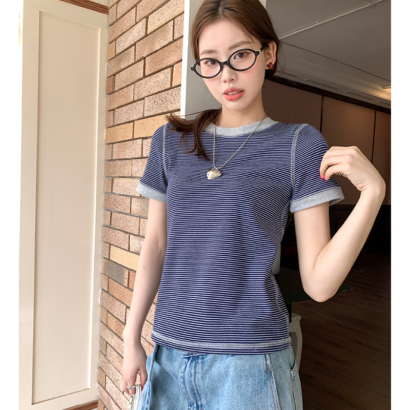실제 가격#간단한 줄무늬 짧은 슬릿 티셔츠 여성을위한 2025 여름 새로운 캐주얼 한 느슨한 티셔츠 다목적 탑