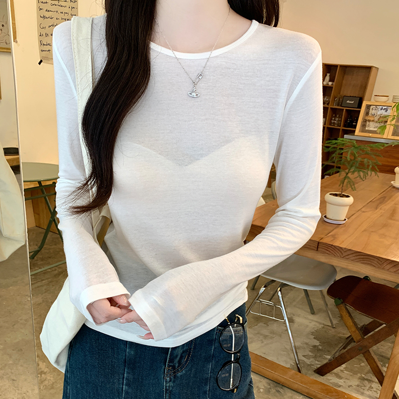실제 가격# 둥근 목 얇은베이스 셔츠 여성용 긴팔 티셔츠 2025 새로운 슬림하고 다재다능한 선 보호 탑