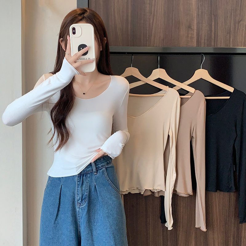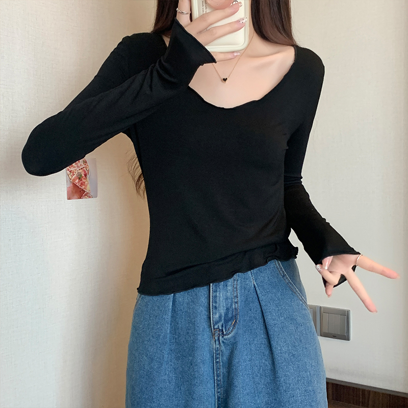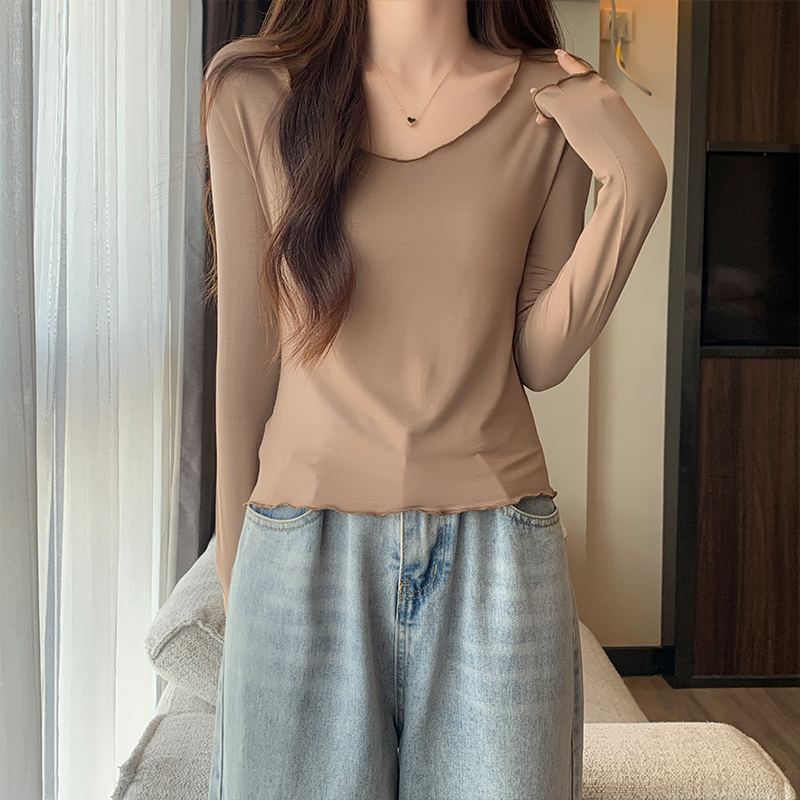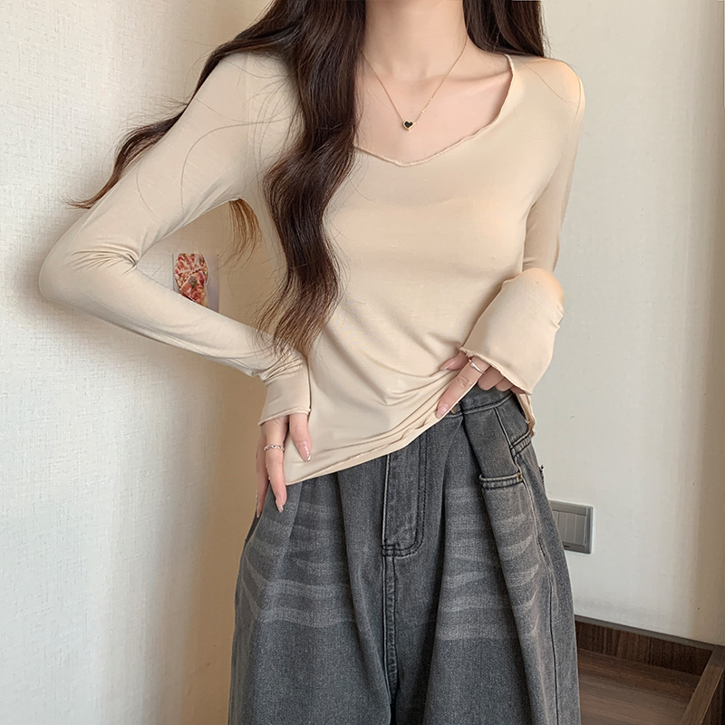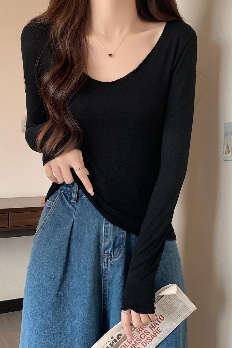 실제 가격#Modal v-Neck 여성용 얇은 봄과 가을 디자인 탑을위한 긴팔 티셔츠, 목재 귀베이스 셔츠