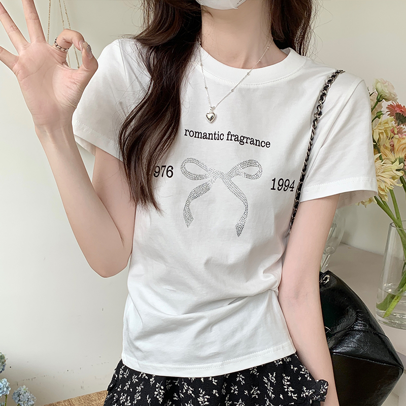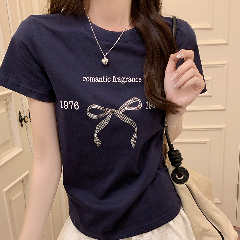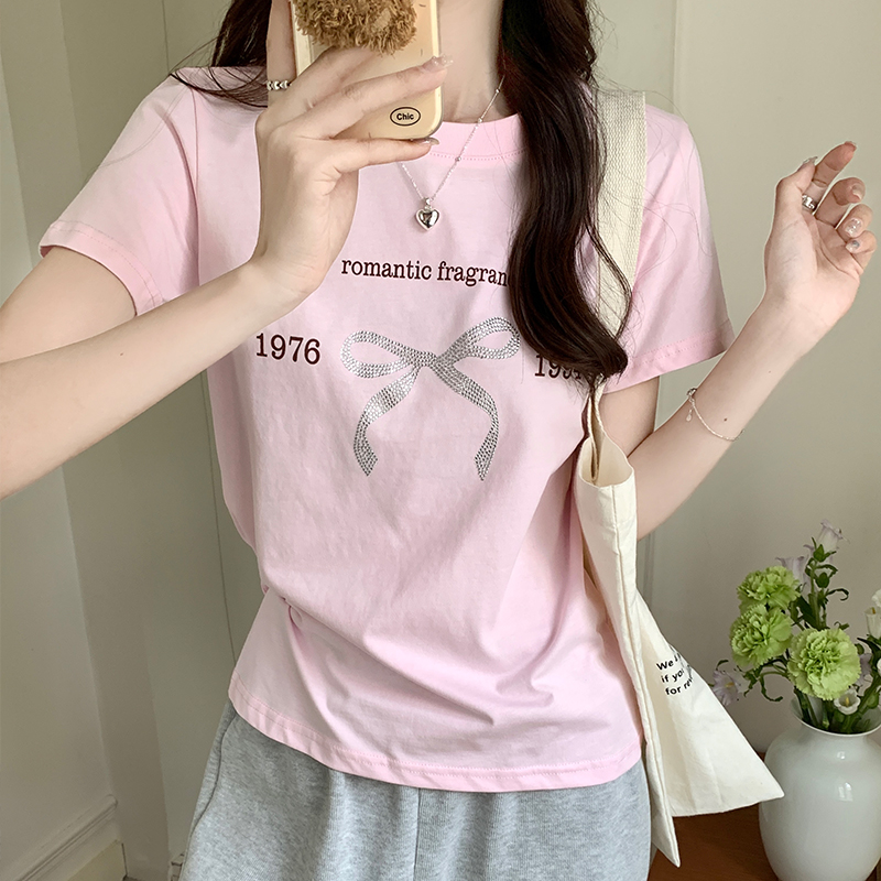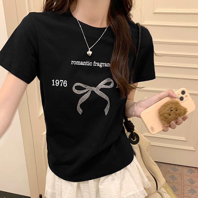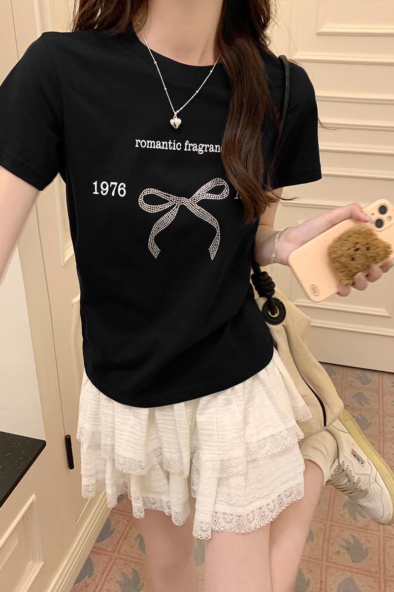 실제 사진 Real Price #American Retro Front Shoulder Short-Sleeved 티셔츠 여자 여름 2025 새로운 활 인쇄 반팔 셔츠