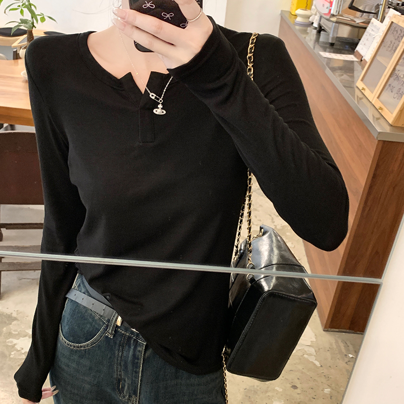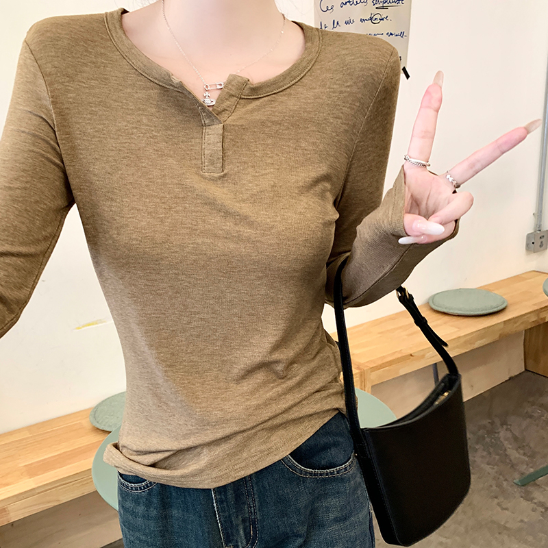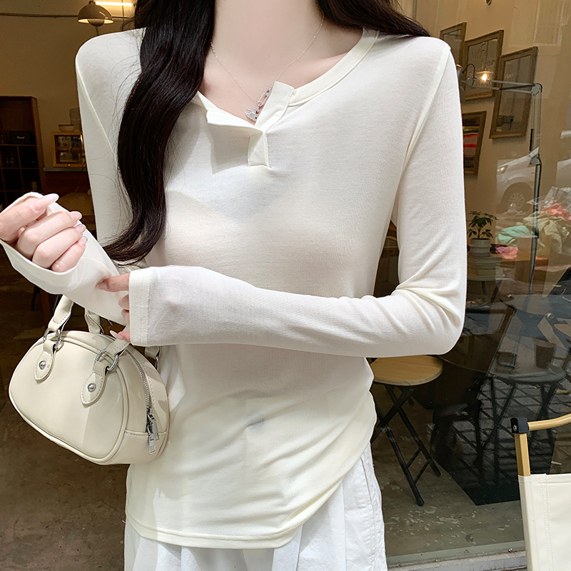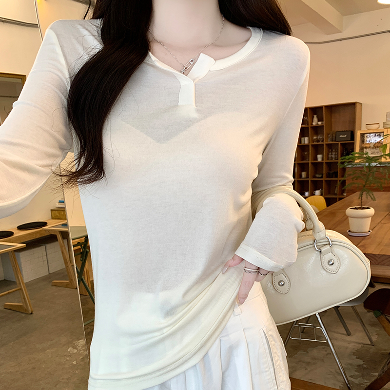 실제 가격#얇은 선 스크린 v- 넥 전면 어깨 긴팔 티셔츠 여성용 2025 새로운 디자인 감각 내부 블라우스 탑