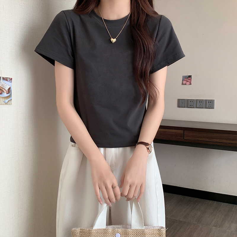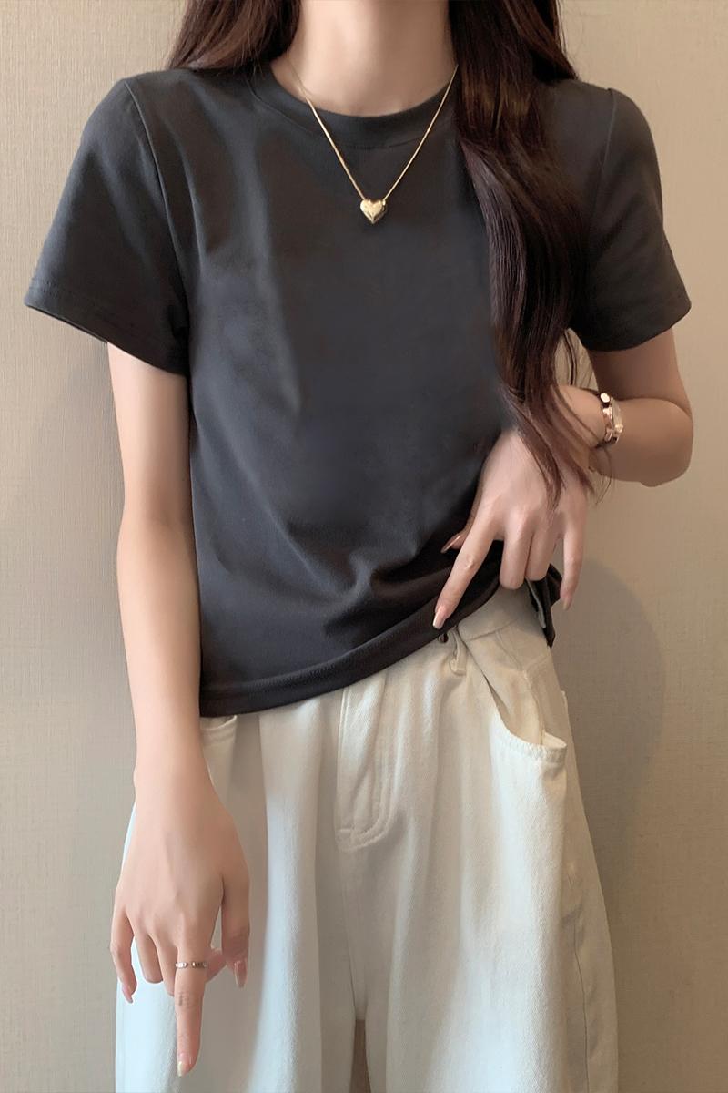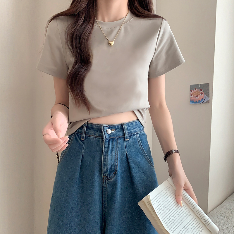 여름에 여성을위한 실제 가격이 책정 된 미국 스타일의 앞쪽 어깨 순수면 단락 테 셔츠 여름에 새로운 유럽 스타일 하이-웨이스트 슬림 탑