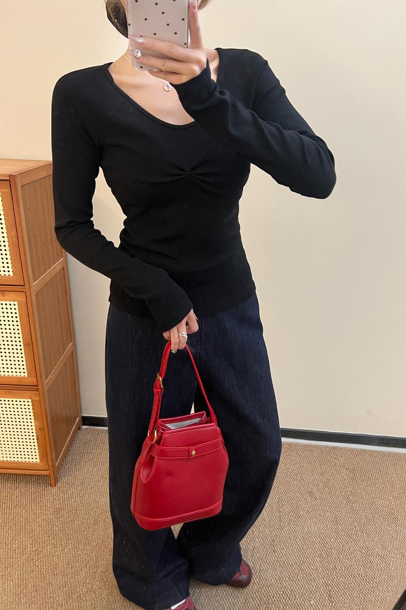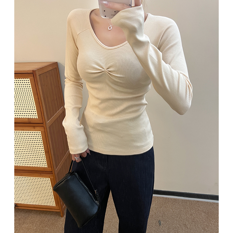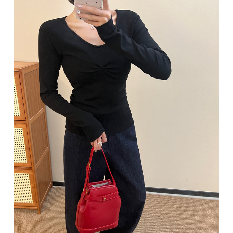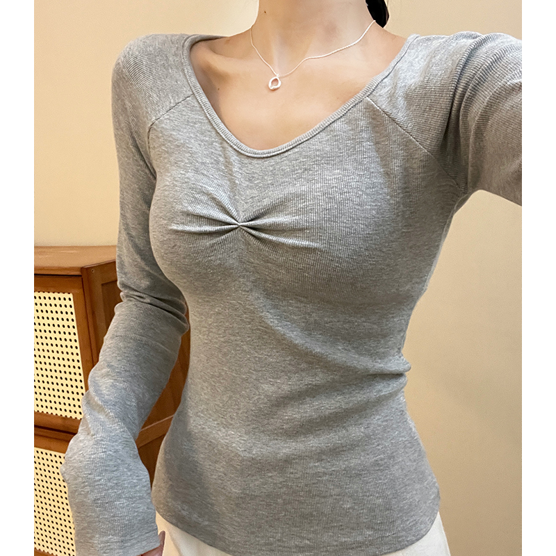 실제 사진 및 가격#전면 어깨 숄더 롱 슬릿 티셔츠 여성용 이른 봄 2025 년 새로운 디자인 틈새 틈새 기본 셔츠 탑