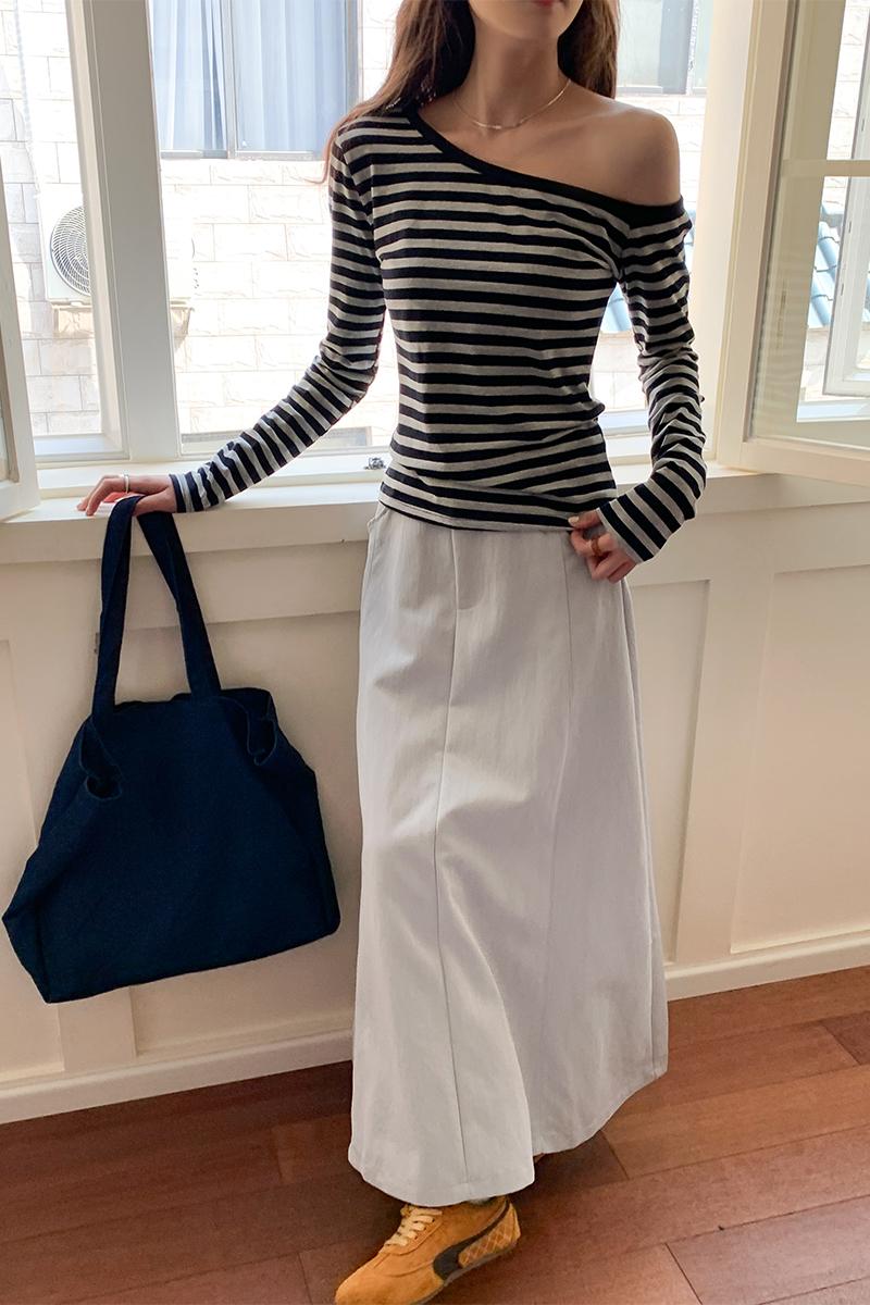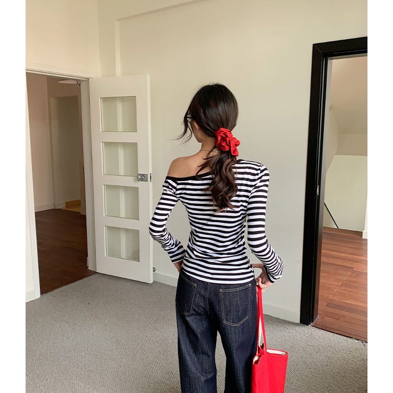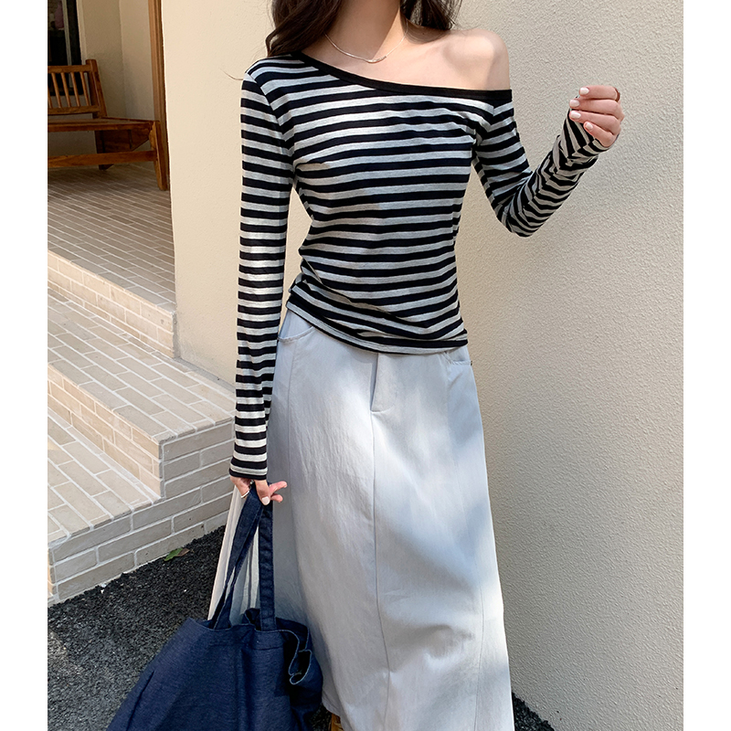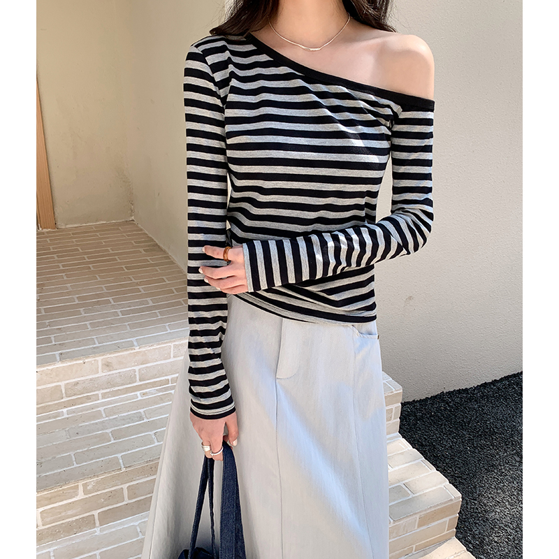 여성용 1 길이 목 경보 어깨 긴팔 티셔츠 2025 이른 가을 새 슬림 줄무늬 여성의 세련된 탑 다목적