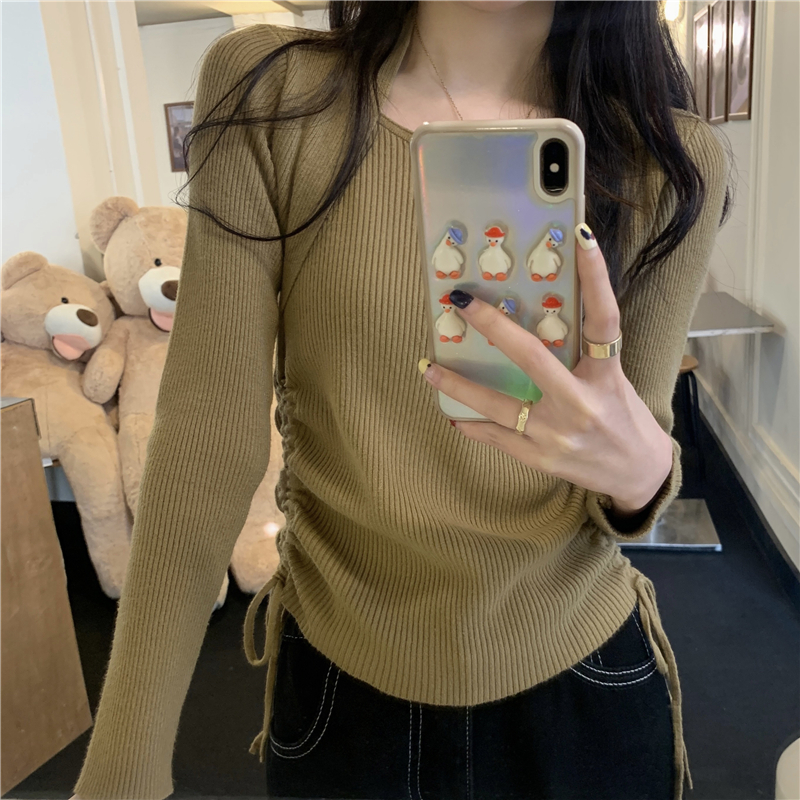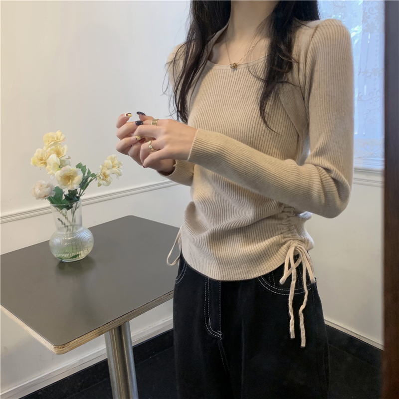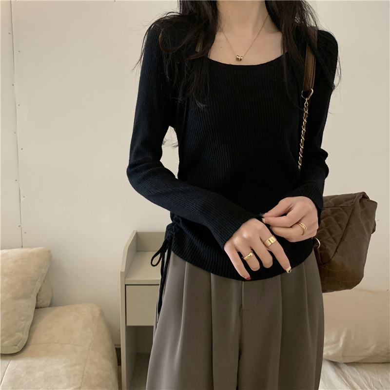 스퀘어넥 펌프 로프 니트 탑 슬림핏 단색 긴팔 상의
