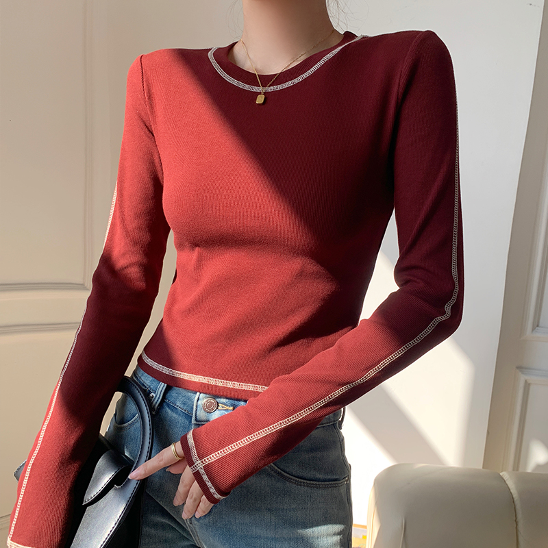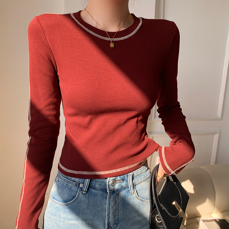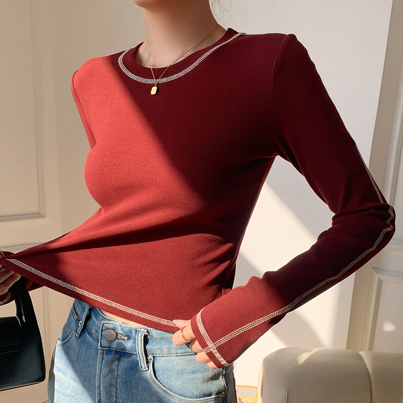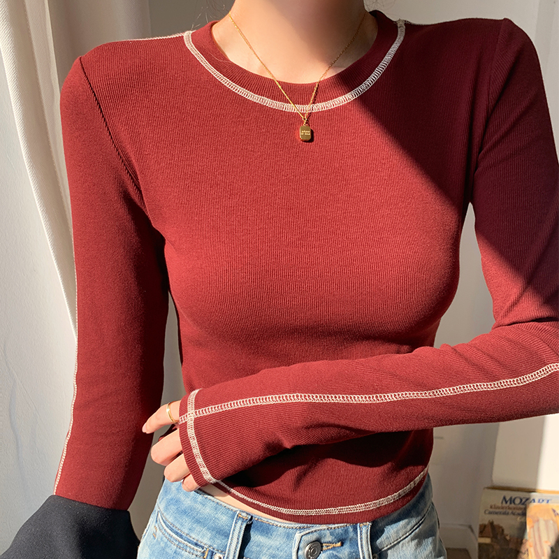 라운드 넥 티셔츠 여성 긴팔 새로운 슬림 얇은 밝은 선 장식 상단 간단한베이스 셔츠