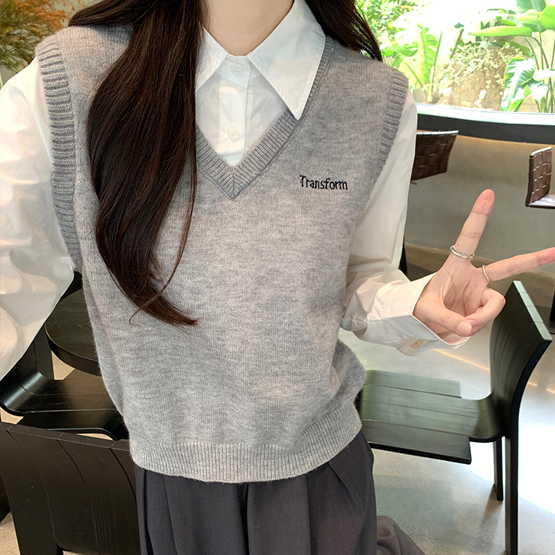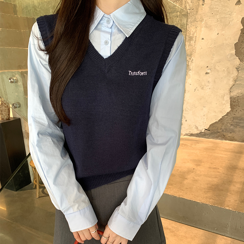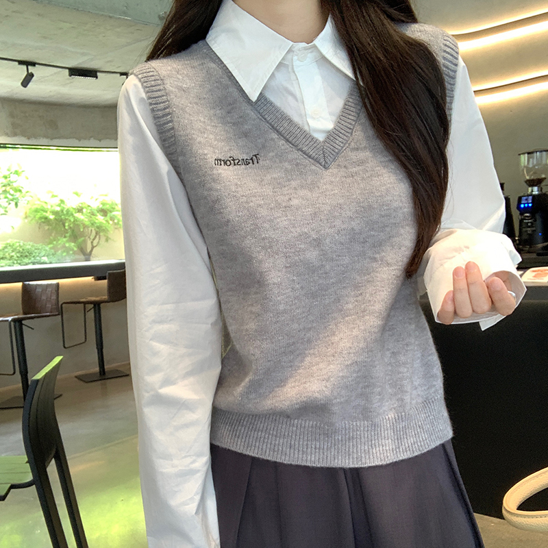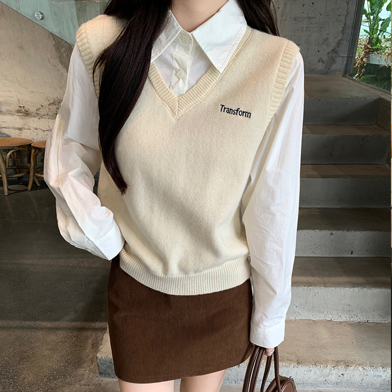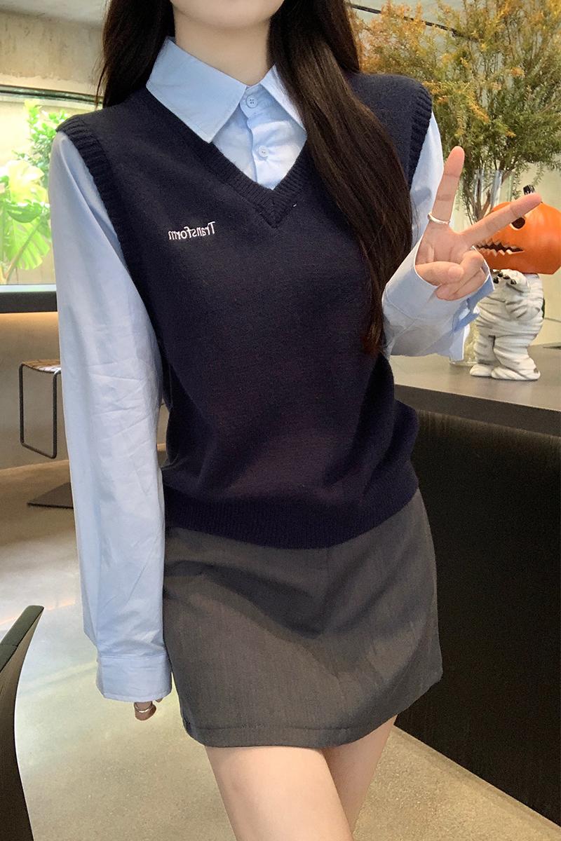Real-Price Real-Life Shot #Academic 스타일 가짜 2 피스 폴로 넥 여자의 가을 단순 디자인 조끼 조끼 셔츠 탑