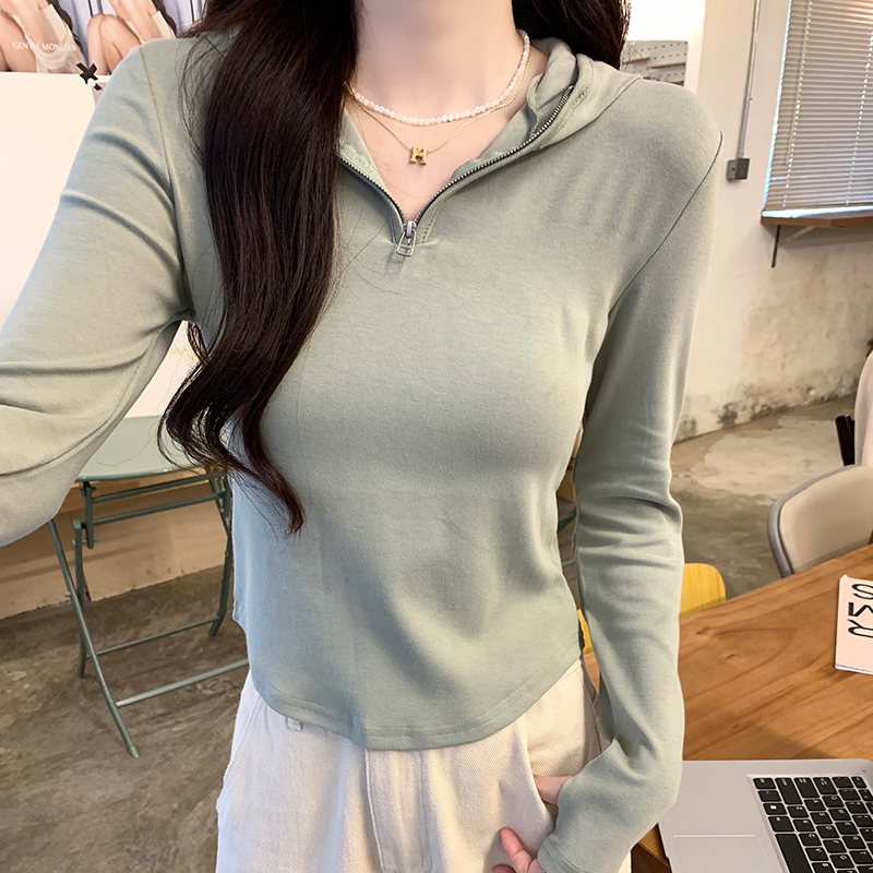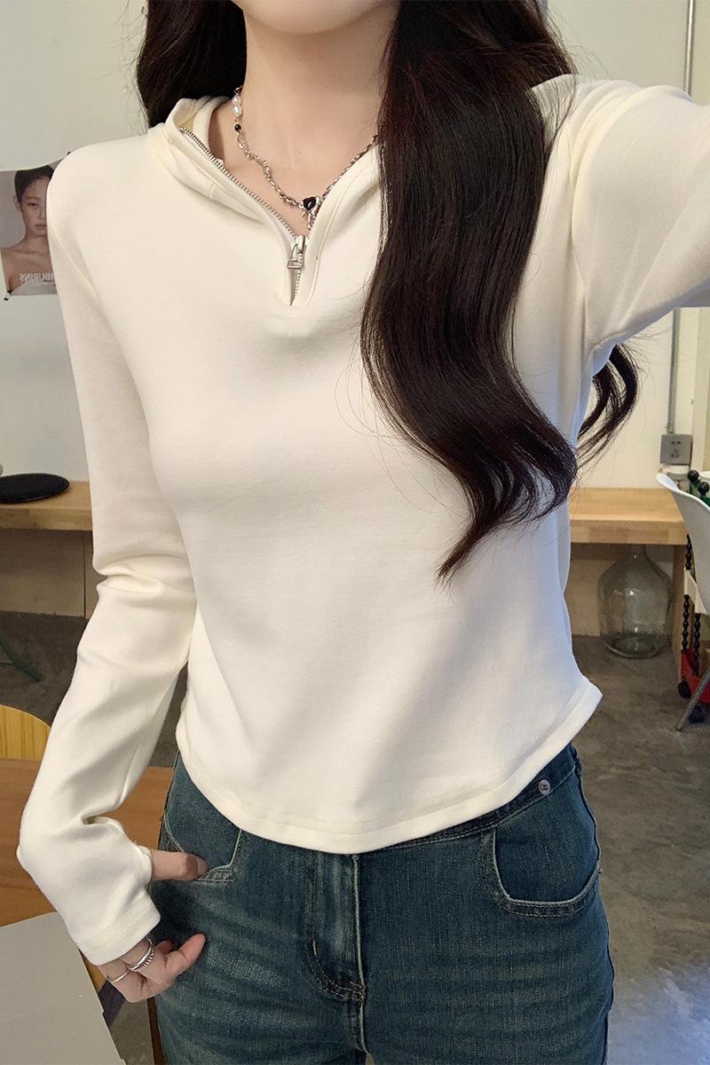 Real-Price Real Shot #Half-Zippered Shoulder Long-Sleeved 티셔츠 봄 디자인 셔츠 셔츠 슬림 한 짧은 상단