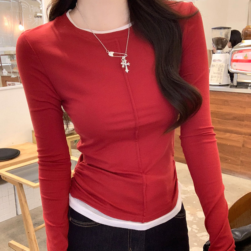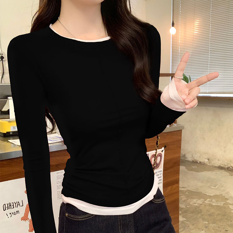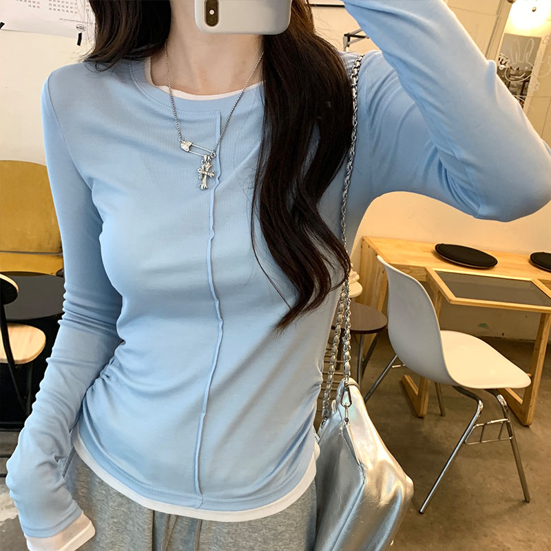 플리츠 디테일과 투피스처럼 보이는 레이어드 디자인이 포인트인 긴팔 티셔츠입니다. 봄·가을 시즌에 단독으로도, 다양한 스타일에 매치하기에도 좋은 다용도 아이템입니다.