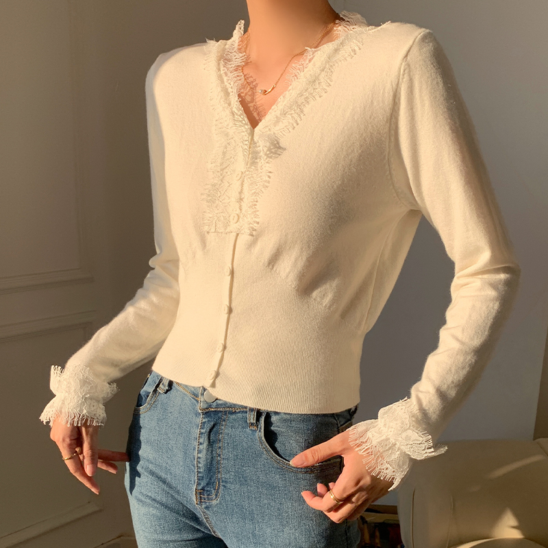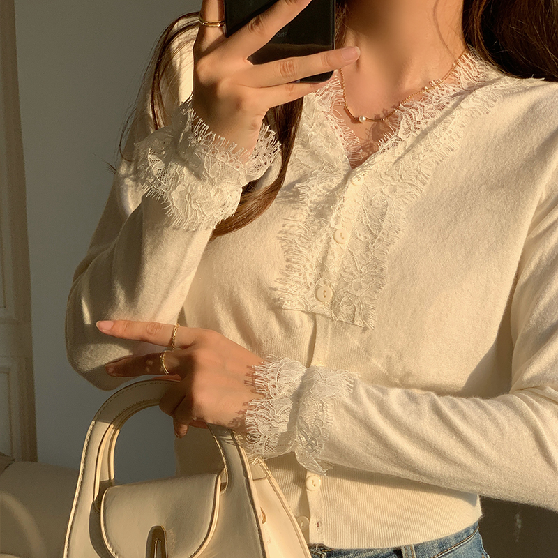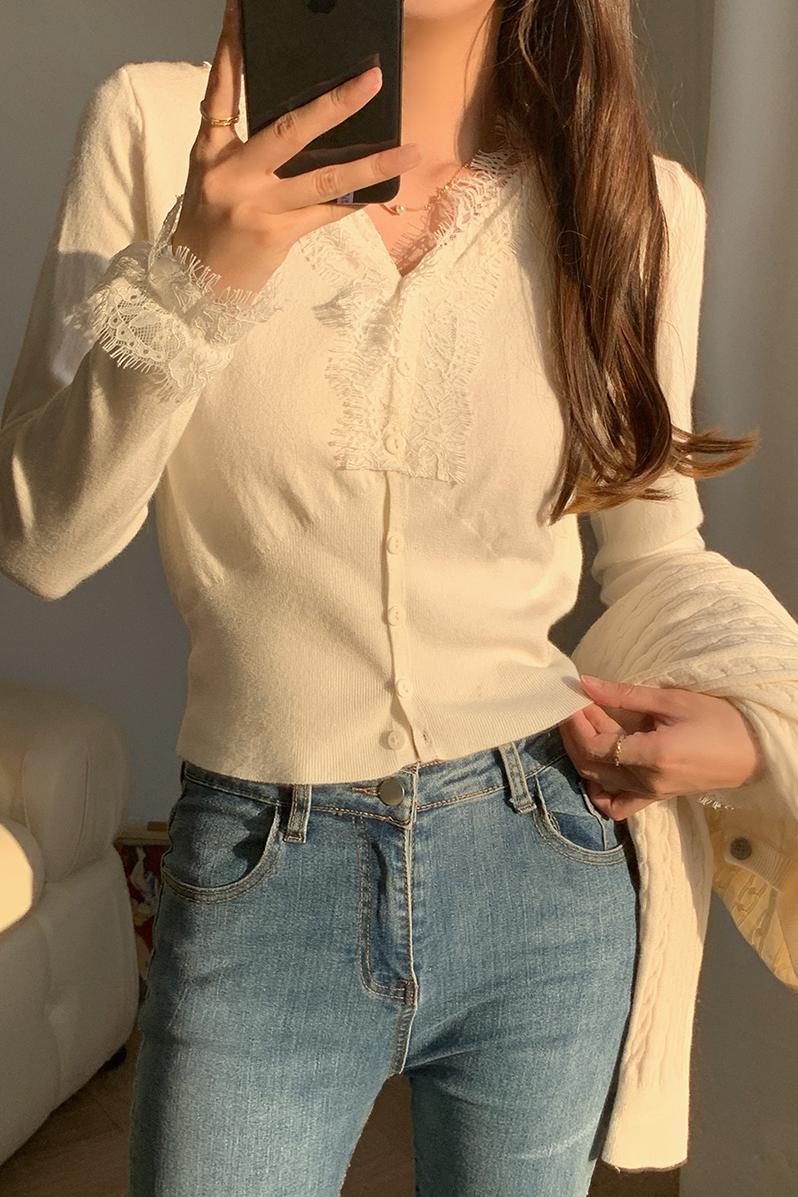 섬세한 레이스와 메쉬 스플라이싱 디테일이 매력적인 V넥 니트 베이스 셔츠입니다. 가을·겨울 시즌에 이너로 활용하기 좋고, 단독으로 입어도 여성스러운 분위기를 연출할 수 있습니다.
