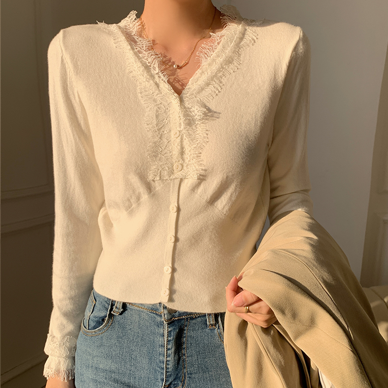 가을·겨울 레이스 메쉬 니트 베이스 셔츠 – 여성용 V넥 슬림핏