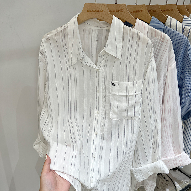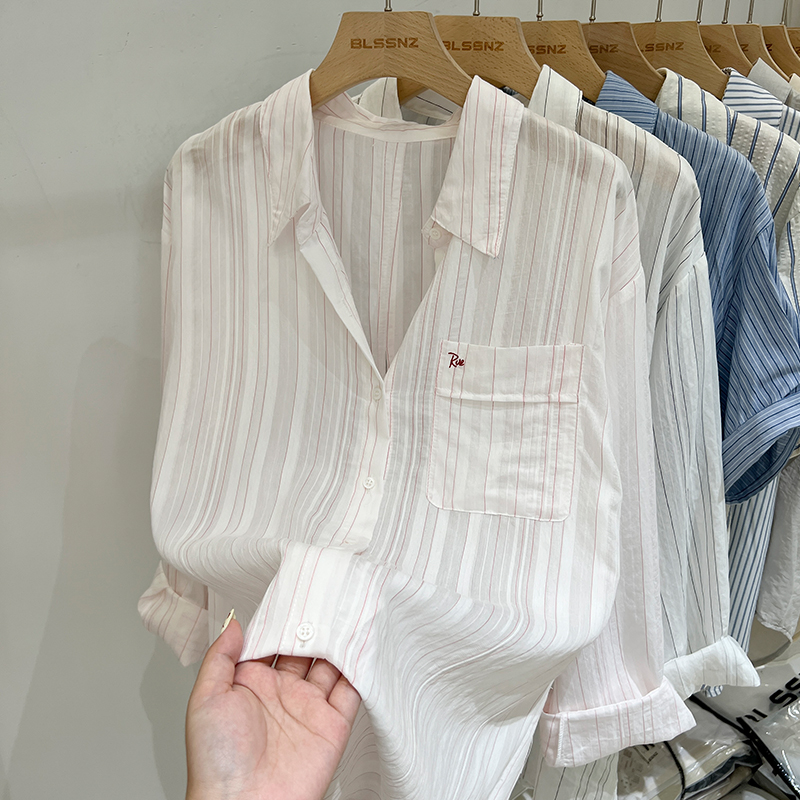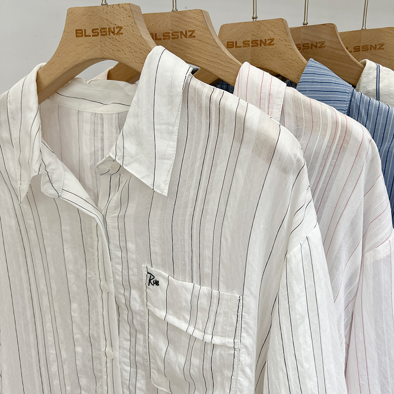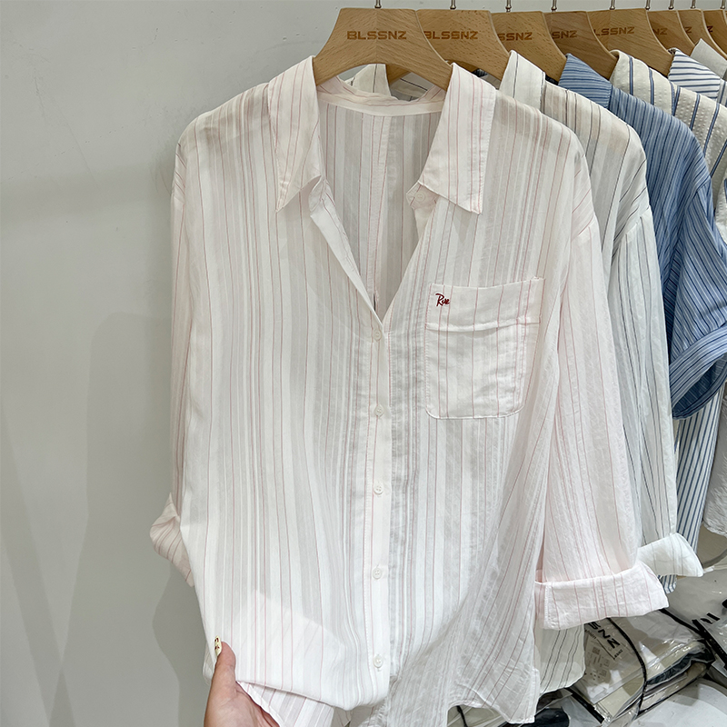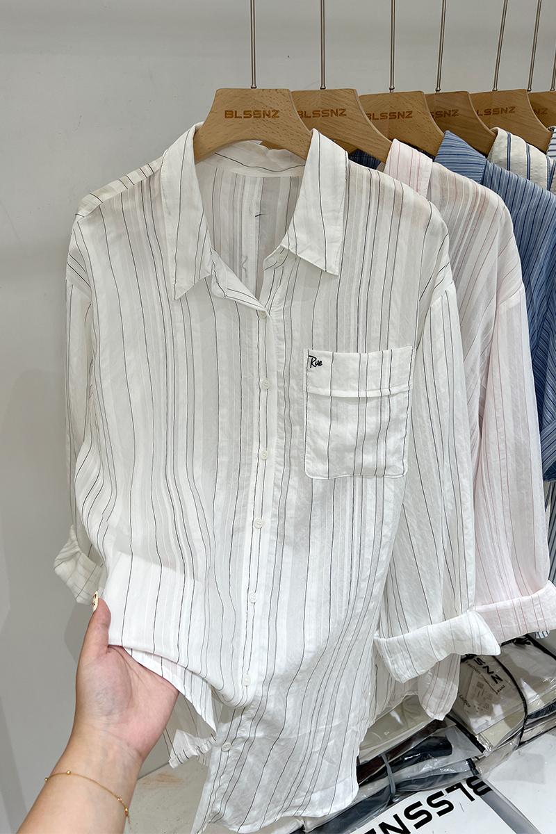 Real-Price Real Shot #여자 선 스크린 재킷을위한 디자인 스트라이프 셔츠 일본어와 한국 스타일 느슨하고 슬리밍 셔츠
