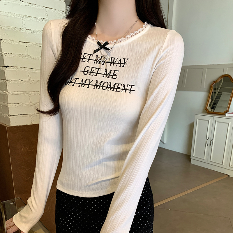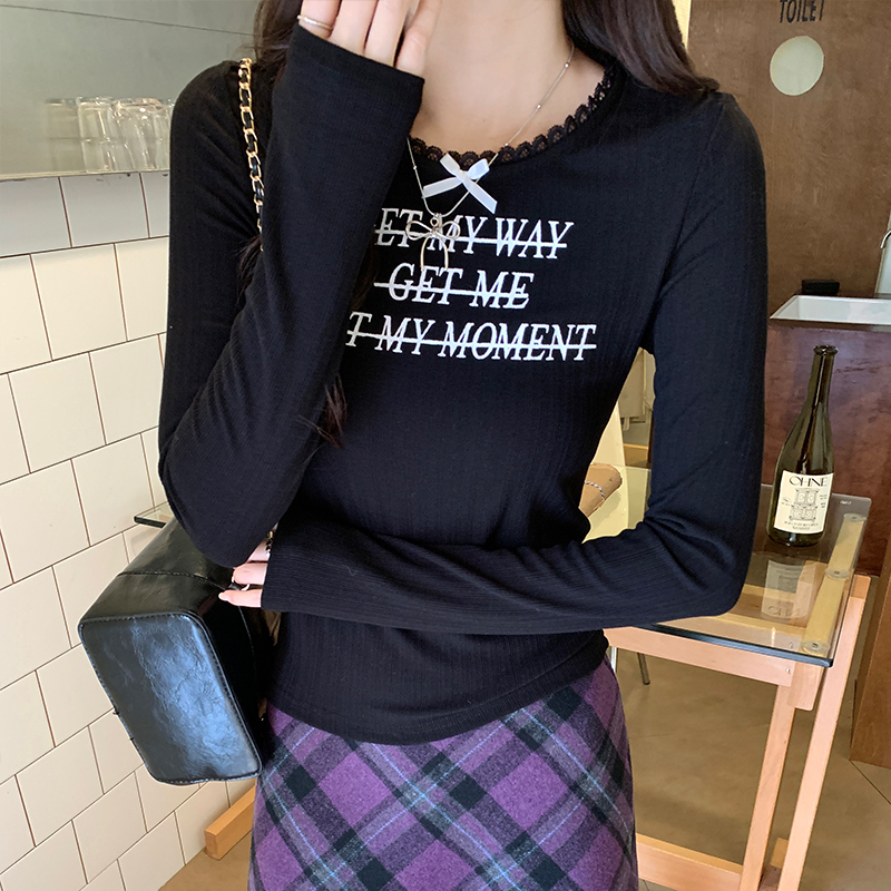실제 가격 실제 샷 #Front Shoulder Lace Square Collar Base Spring and Autumn Slim Sexy Hot Girl Tight Long-Sleeved T-Shirt Top