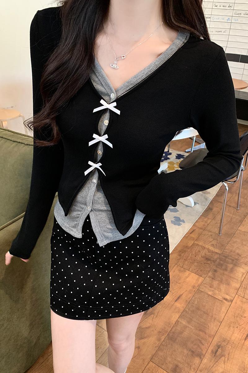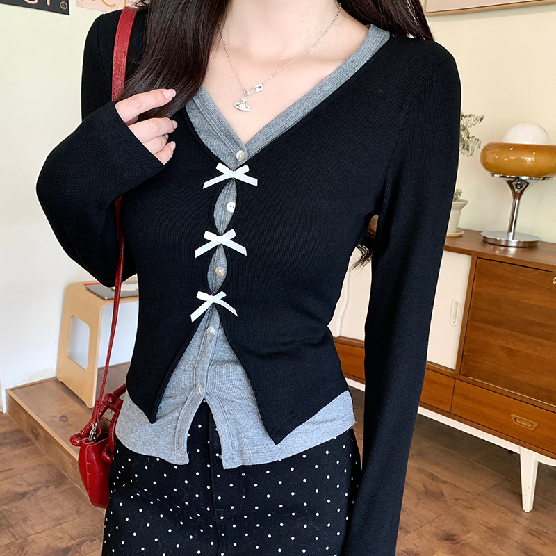 Real-Price Real Shot #contrast 색상 스 플라이 싱 가짜 2 피스 보우 긴팔 티셔츠