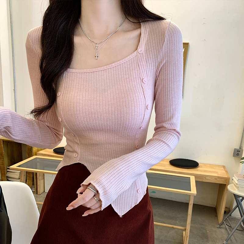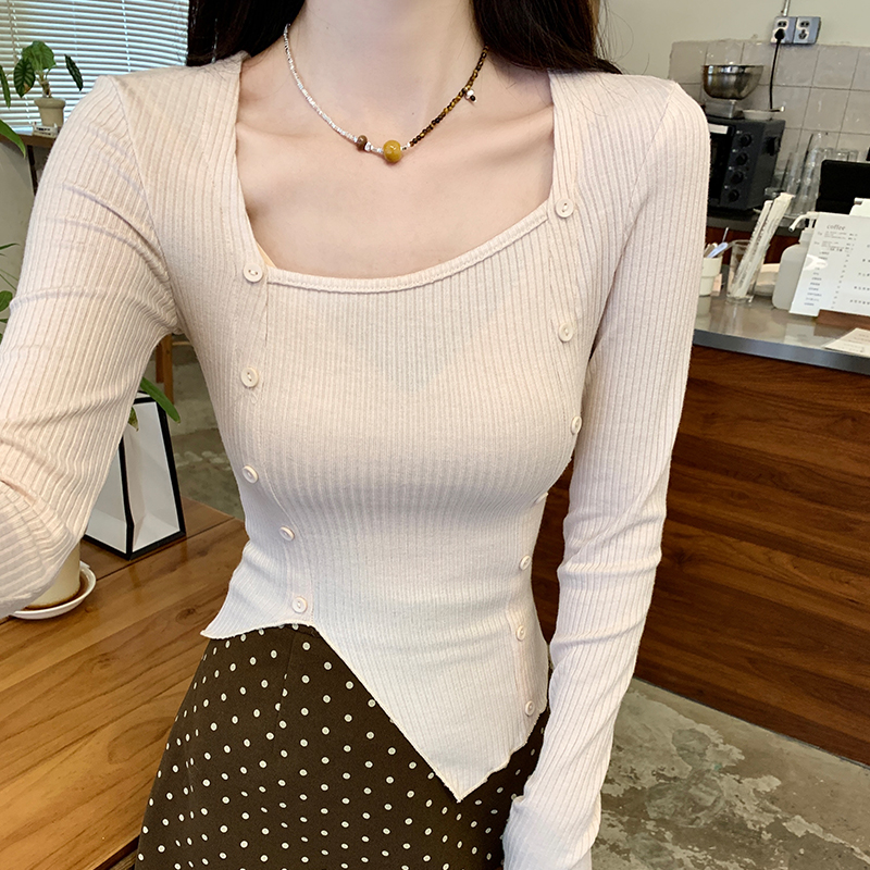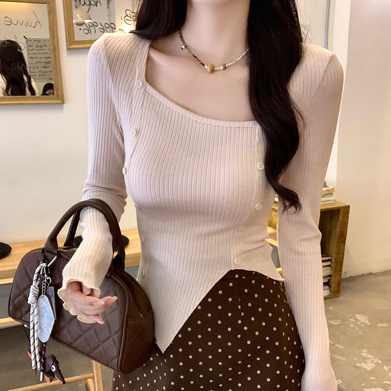 french 불규칙한 사각형 칼라 여성용 긴팔 기본 셔츠 가을 슬림 디자인 슬릿 탑