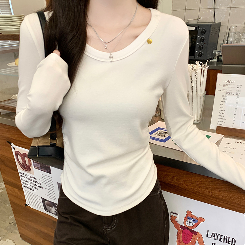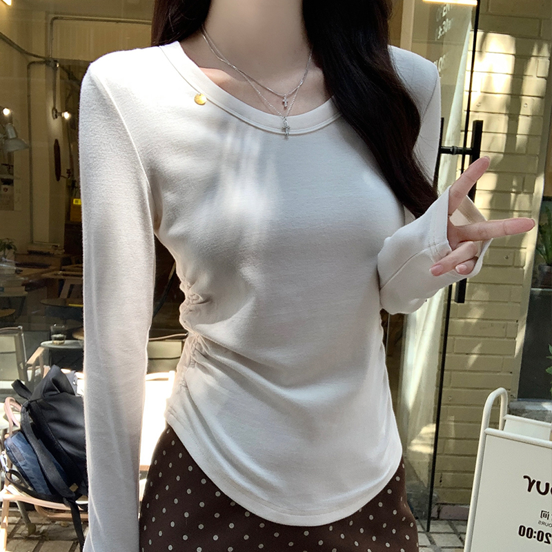 Simple 주름 허리 티셔츠 여성용 가을 새로운 세련된 유행 및 다목적 짧은 기본 탑
