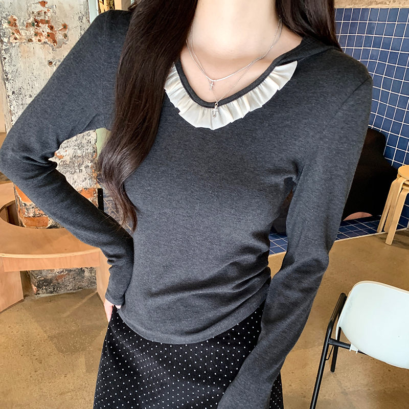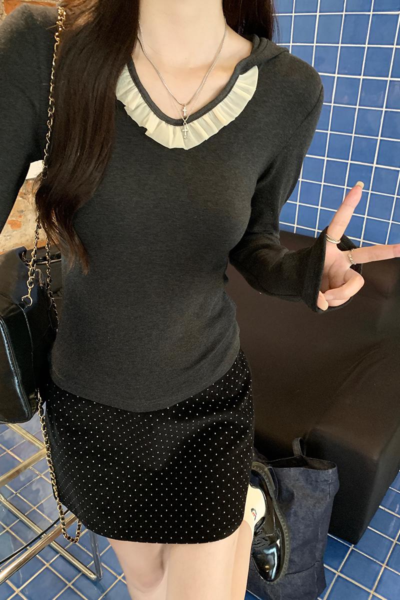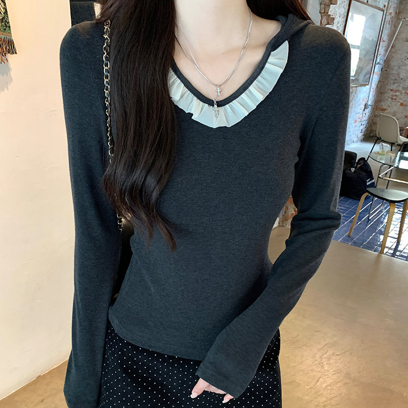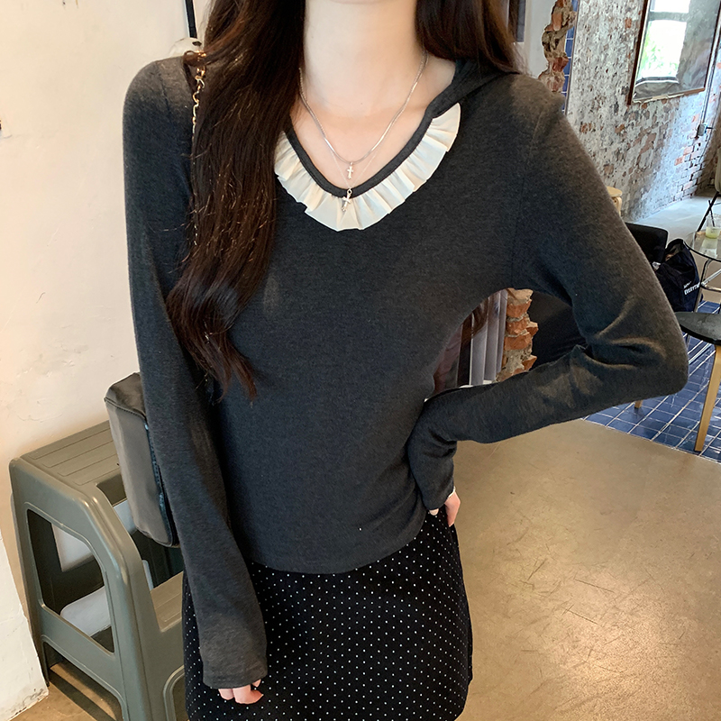Real-Price Real Shot #Grey Hooded V-Neck Front Shoulder Long-Sleeved T-Shirt in Autumn Slim Short Base Shirt 속옷
