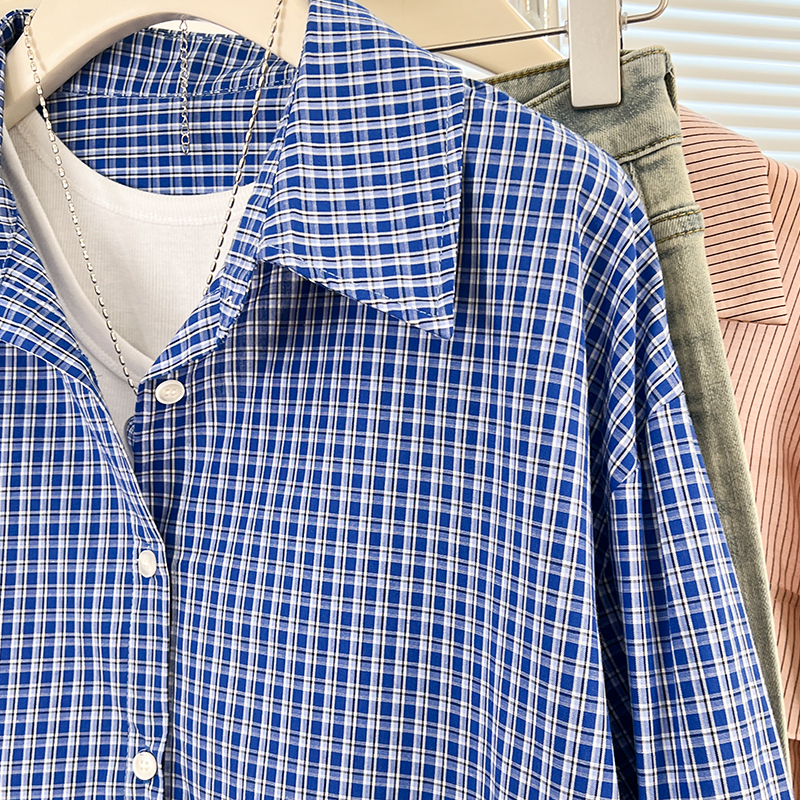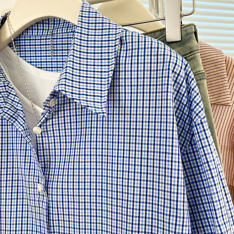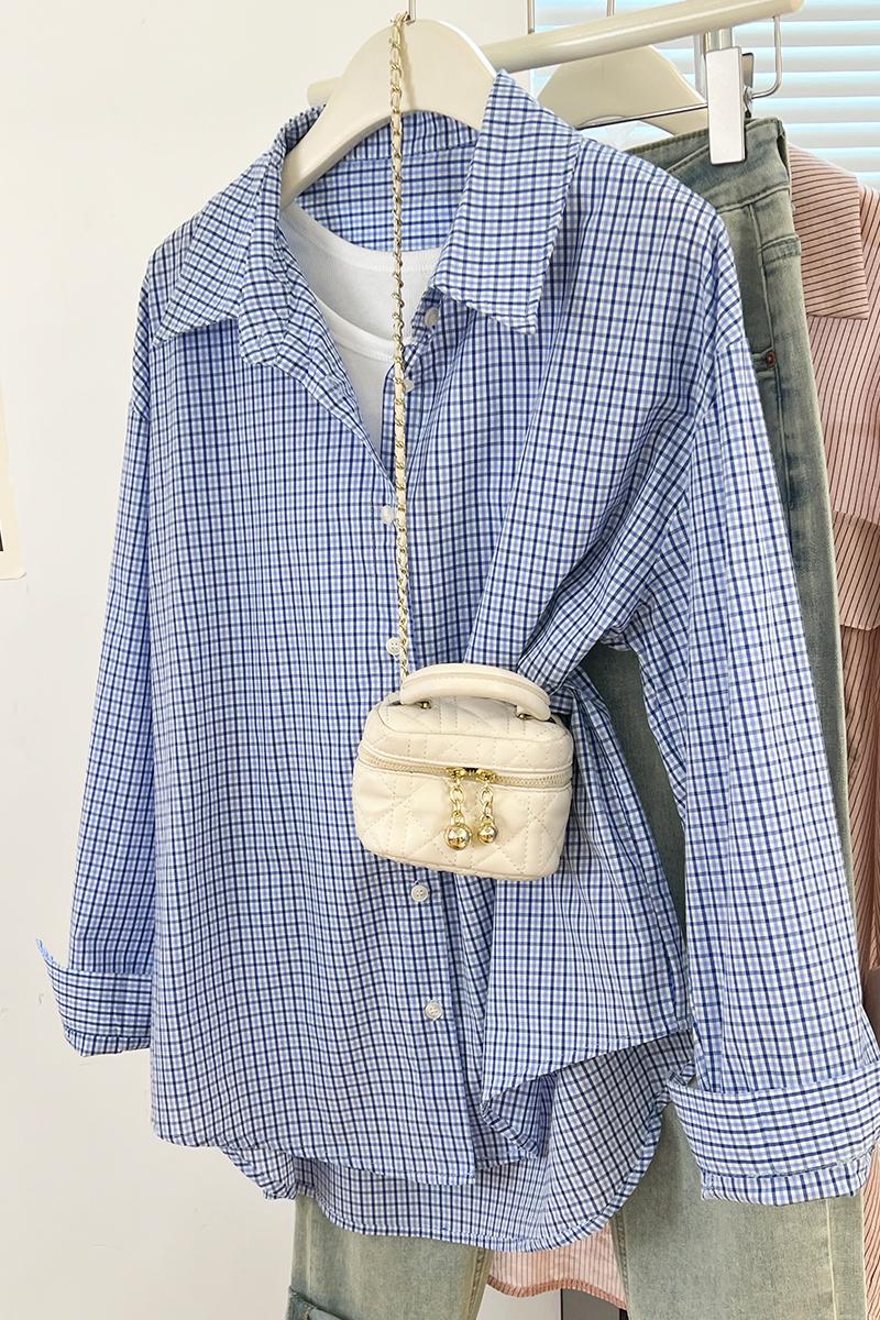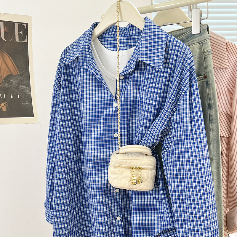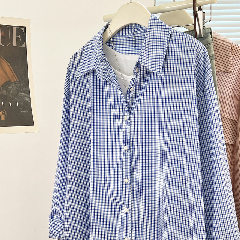 실제 가격 진짜 샷 #Blue 격자 무늬 셔츠 여자 가을 프랑스 작은 셔츠 재킷 캐주얼 느슨한 긴팔 탑