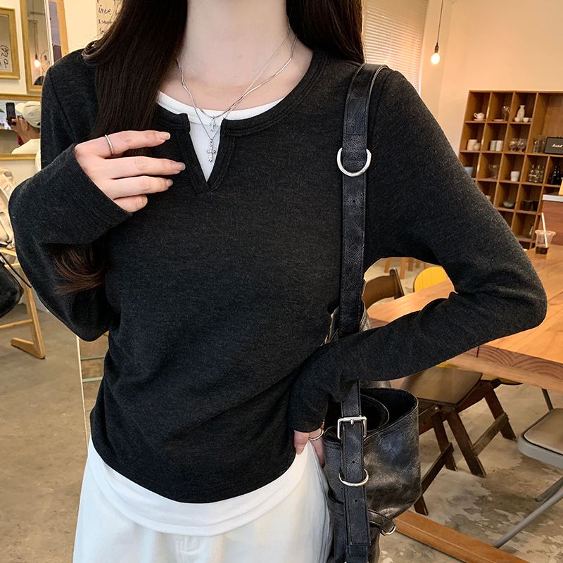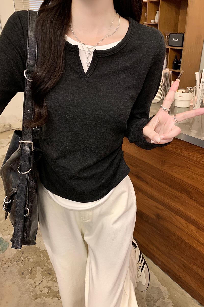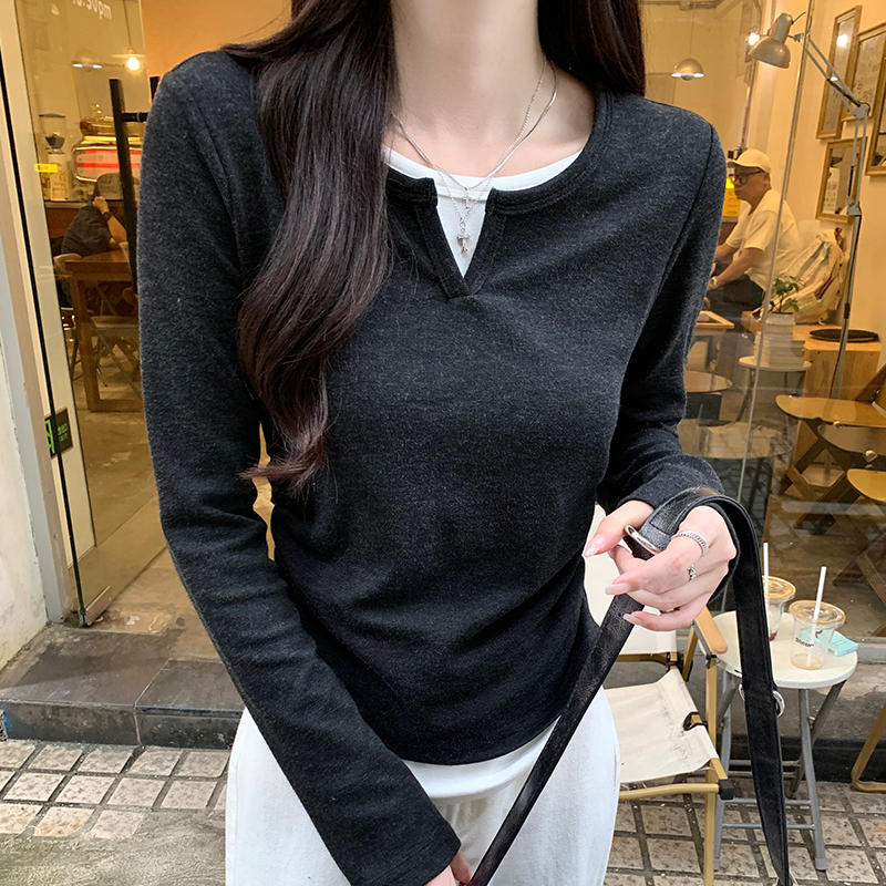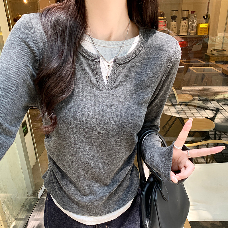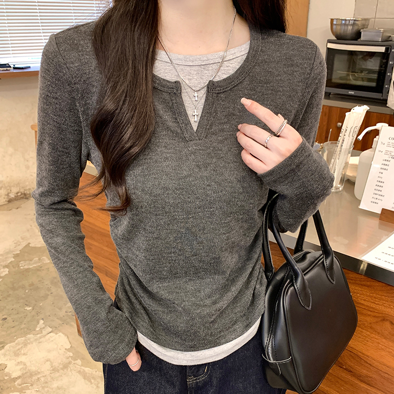 진짜 가격 실제 샷 #Grey 가을에있는 2 피스 2 피스 주름 허리 길이 어깨 긴팔 티셔츠 가을베이스 셔츠 속옷
