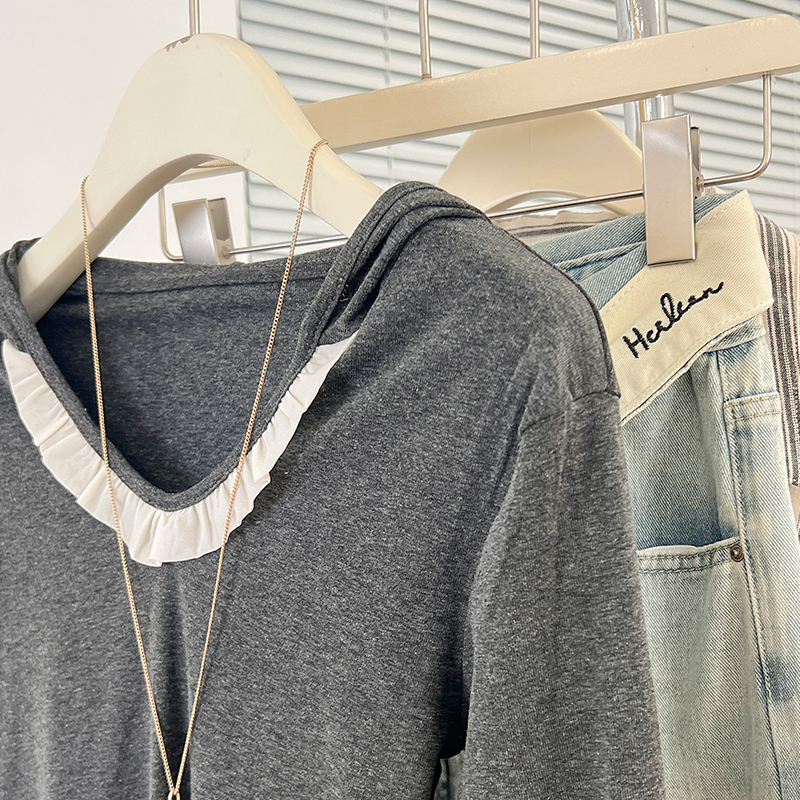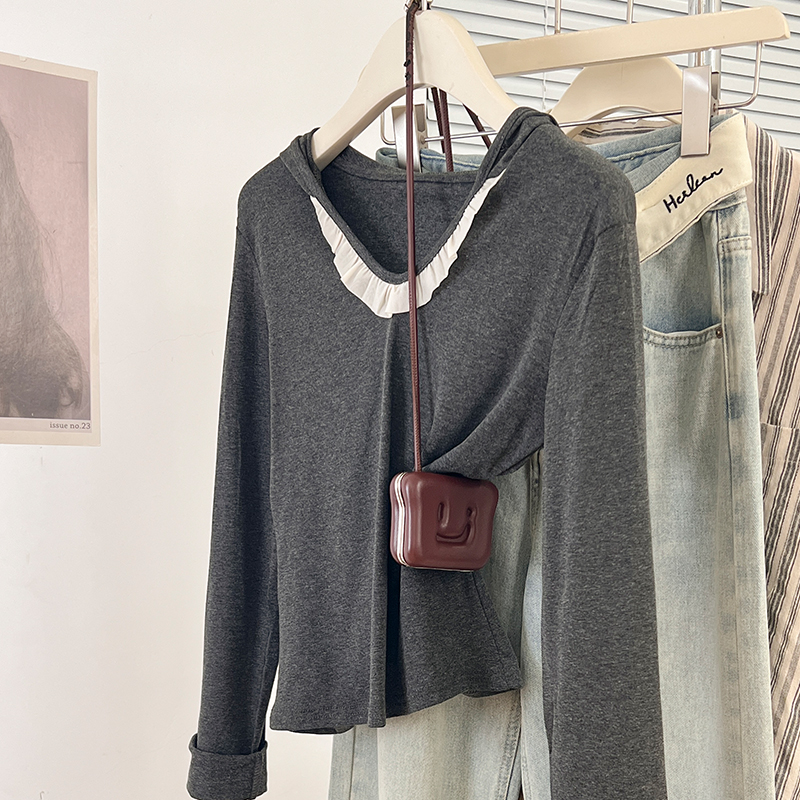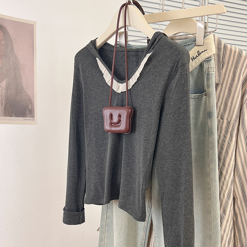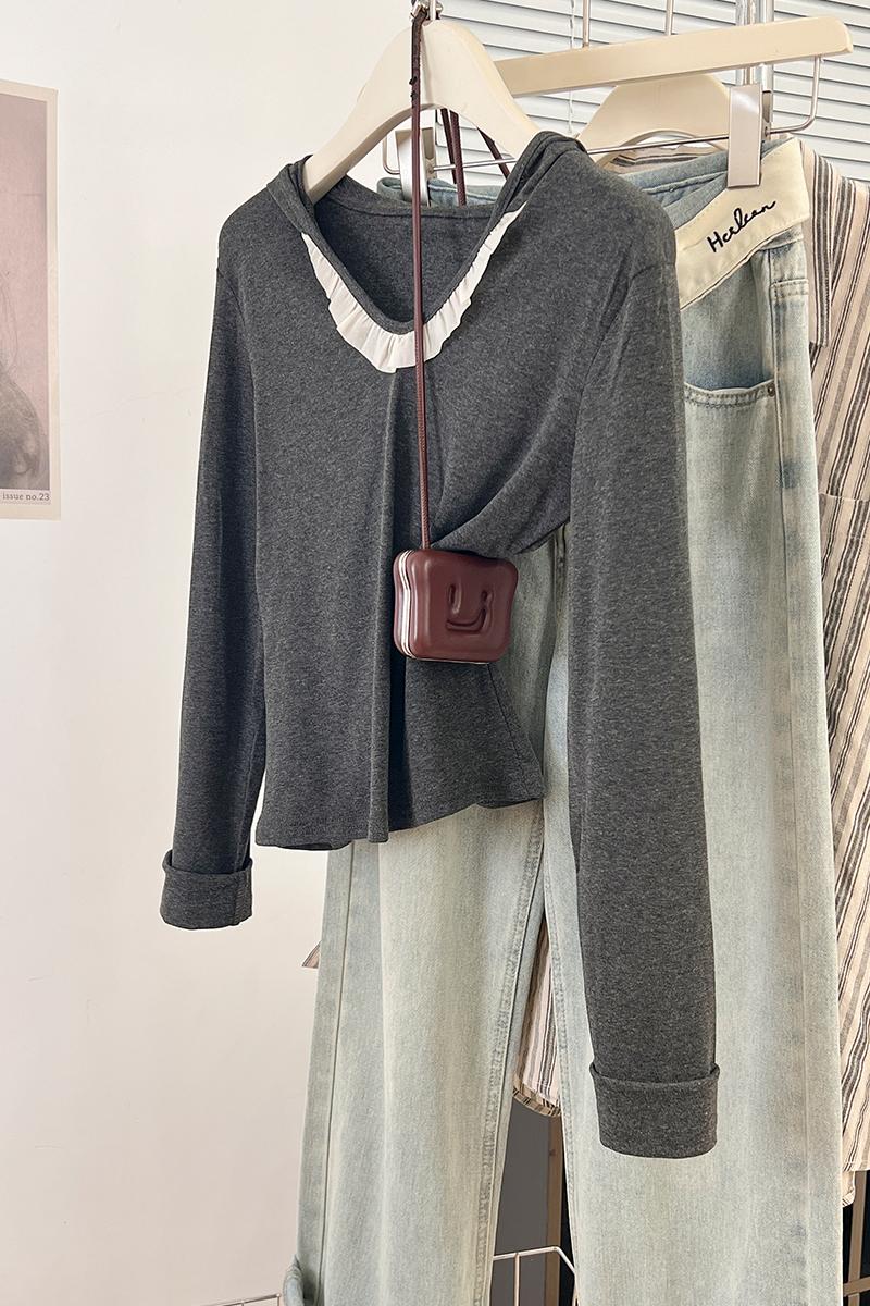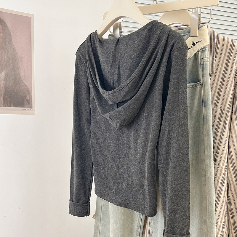 Real-Price Real Shot #Grey Hooded V-Neck Front Shoulder Long-Sleeved T-Shirt in Autumn Slim Short Base Shirt 속옷