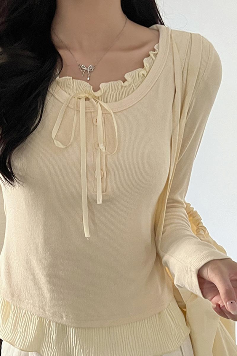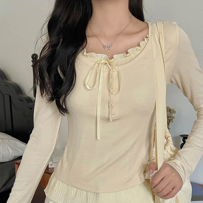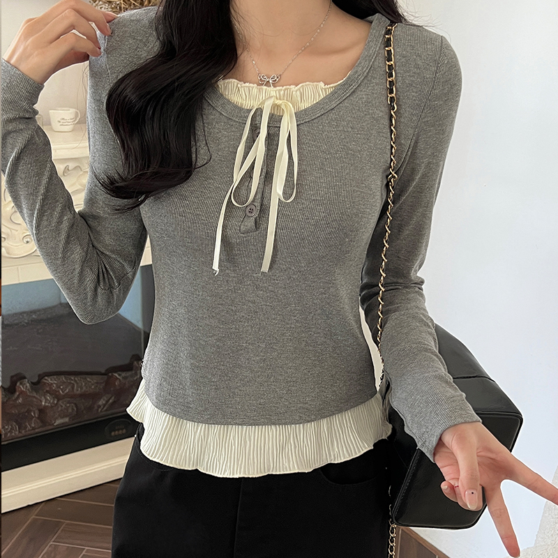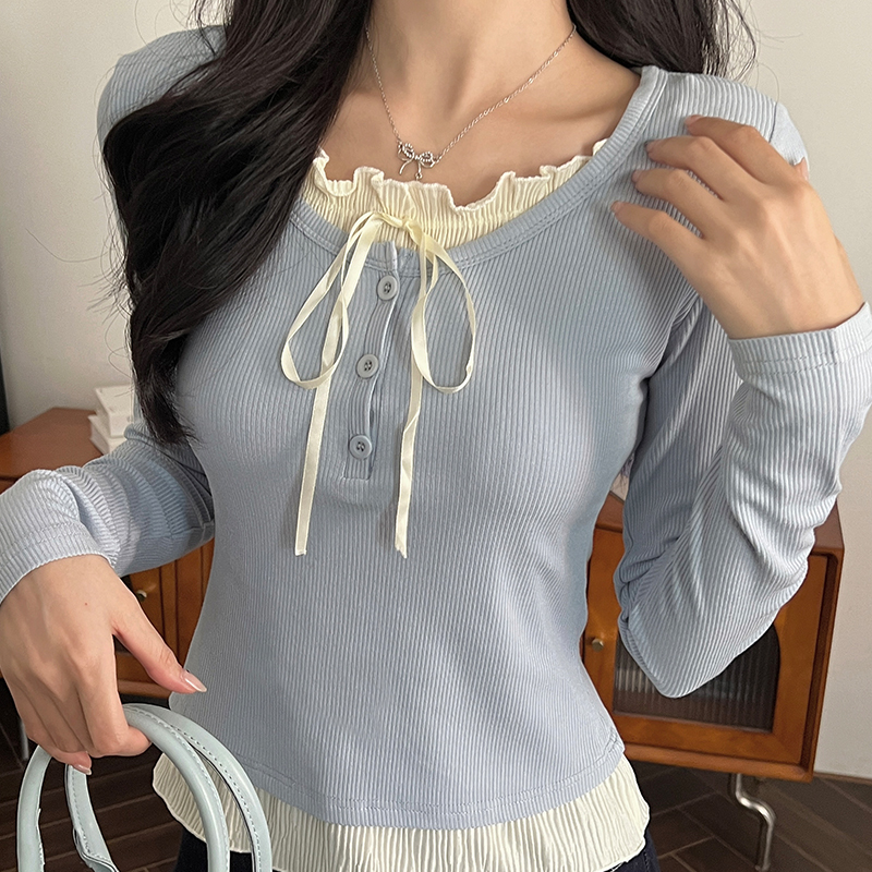 실제 가격 진짜 샷 #Blue bow 가짜 2 피스 갈기 여자 봄과 가을베이스 셔츠를위한 uck 롱-슬리브 티셔츠 짧은 탑