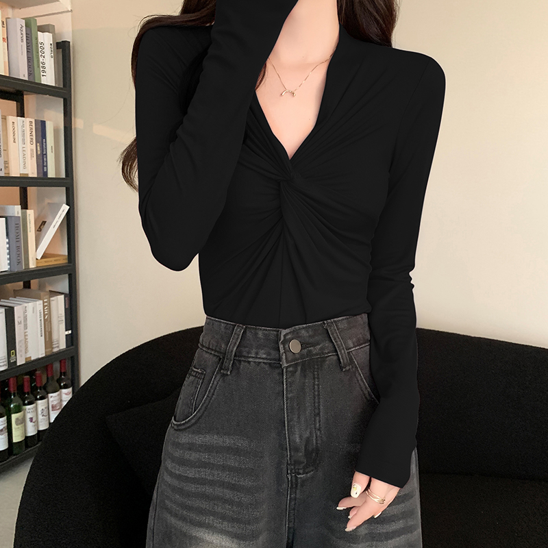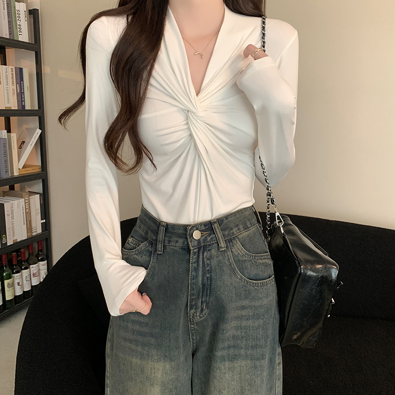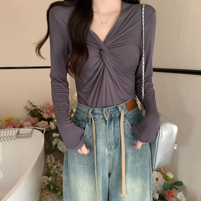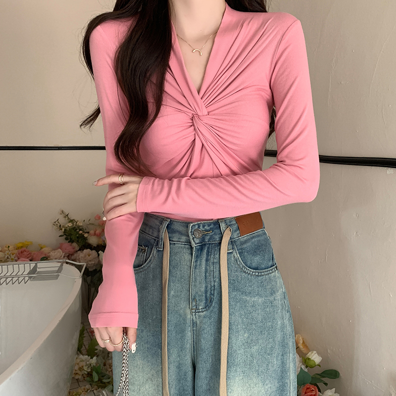 실제 가격의 실제 샷 #EUROPEAN V-NECK Long-Sleeved T-Shirt in Autumn New Base Shirt 디자인 틈새 쇼트 탑