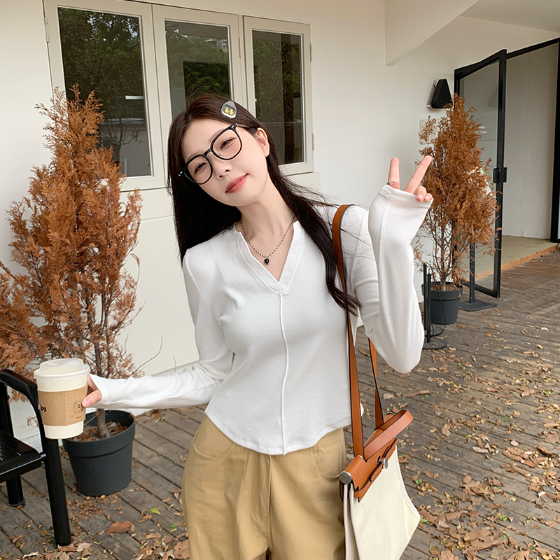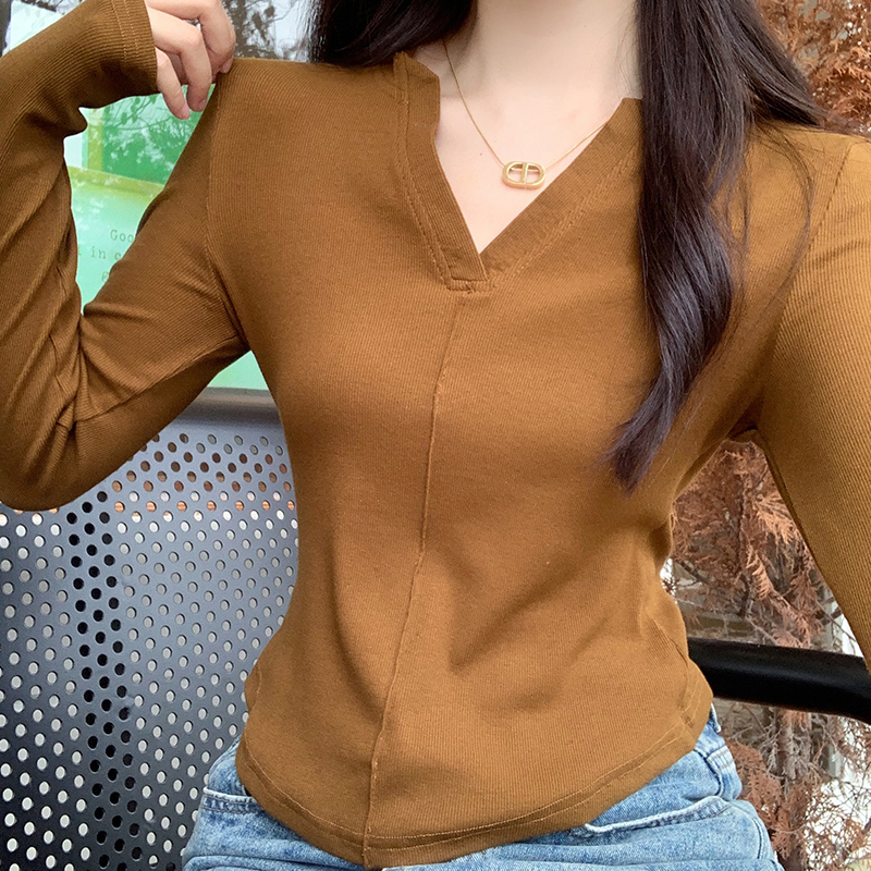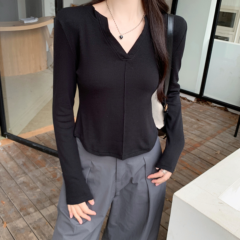 Real-Price Real-Life Photos #EUROPEAN V-NECK Long-Sleeved 티셔츠 가을 의류 여성을위한 새로운 유행 슬림 짧은 상단베이스 셔츠