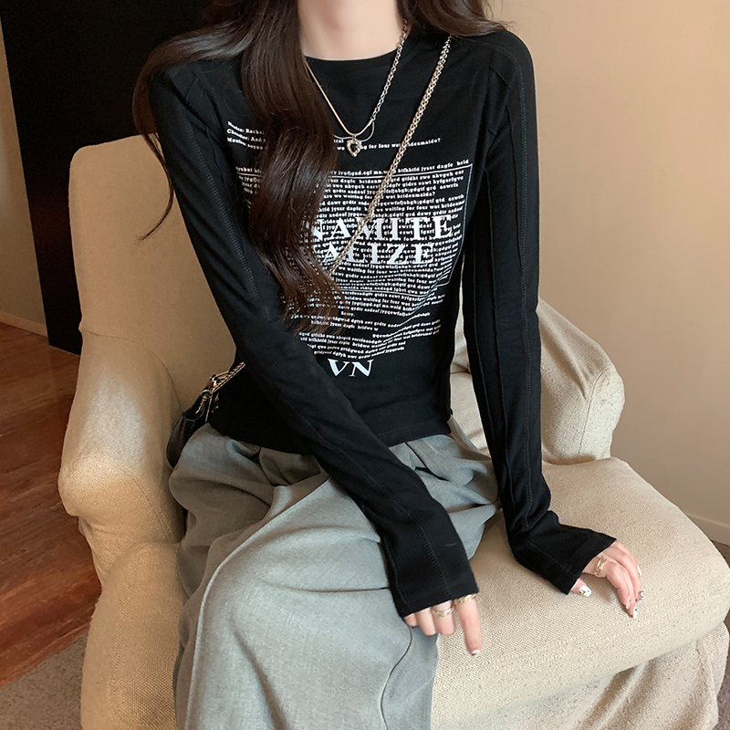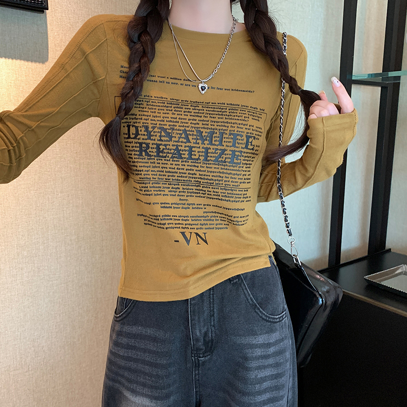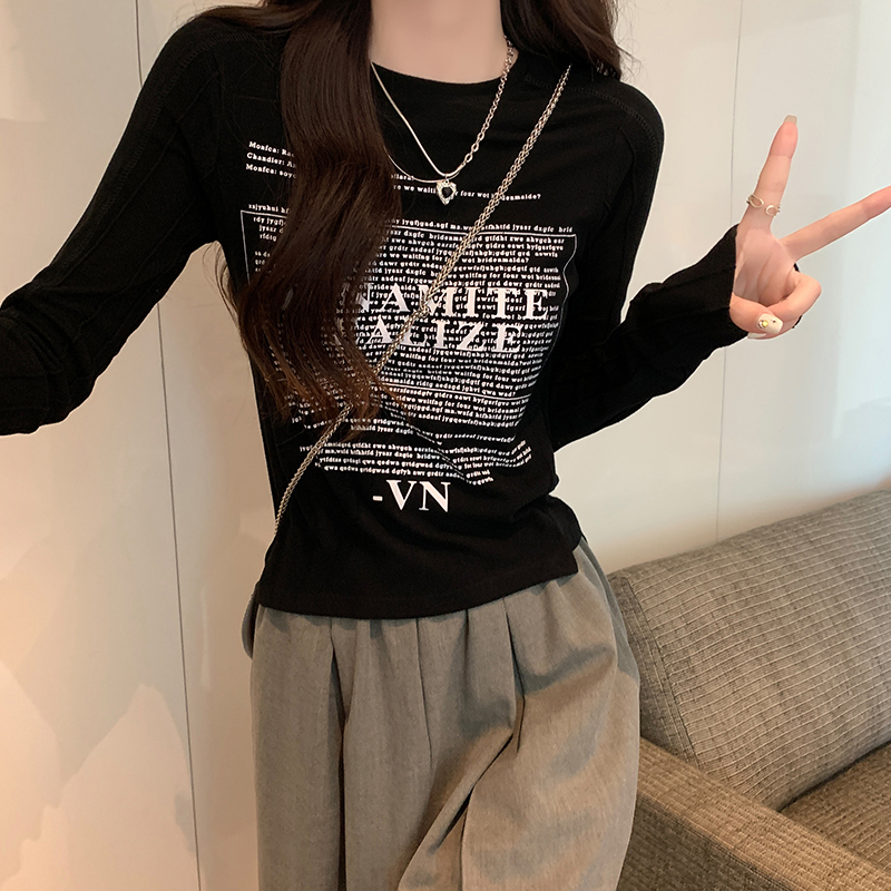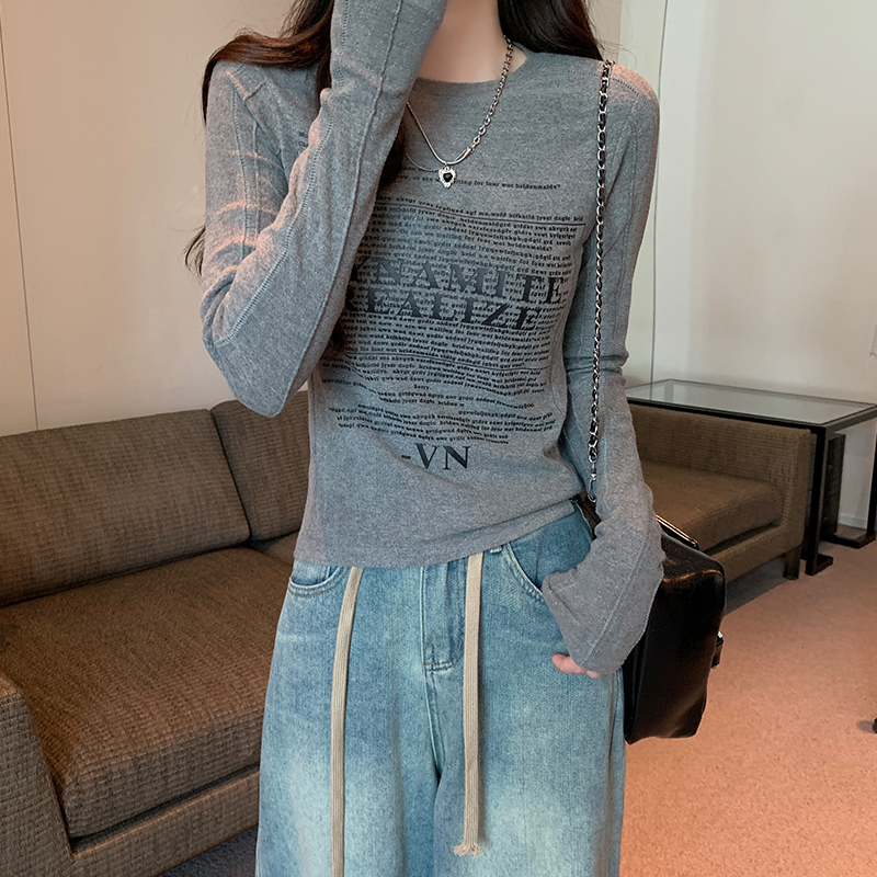 Real-Price Real-Life Shot #Grey American Retro 인쇄 분쇄 봄과 가을 바닥 셔츠에서 여성을위한 긴팔 티셔츠