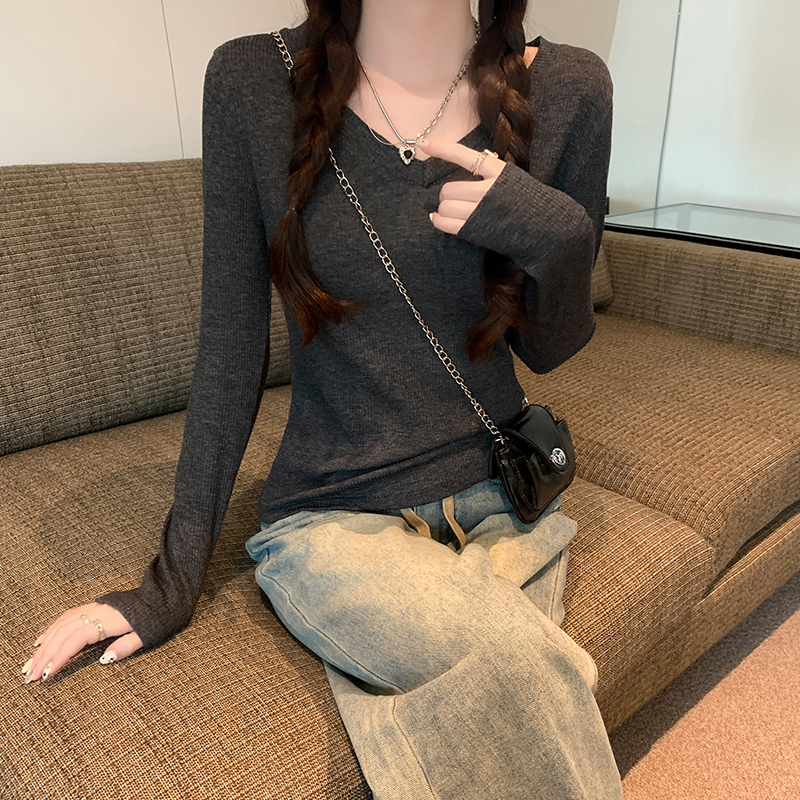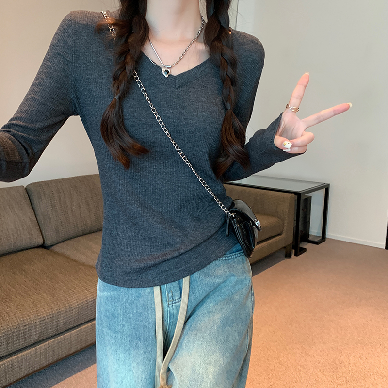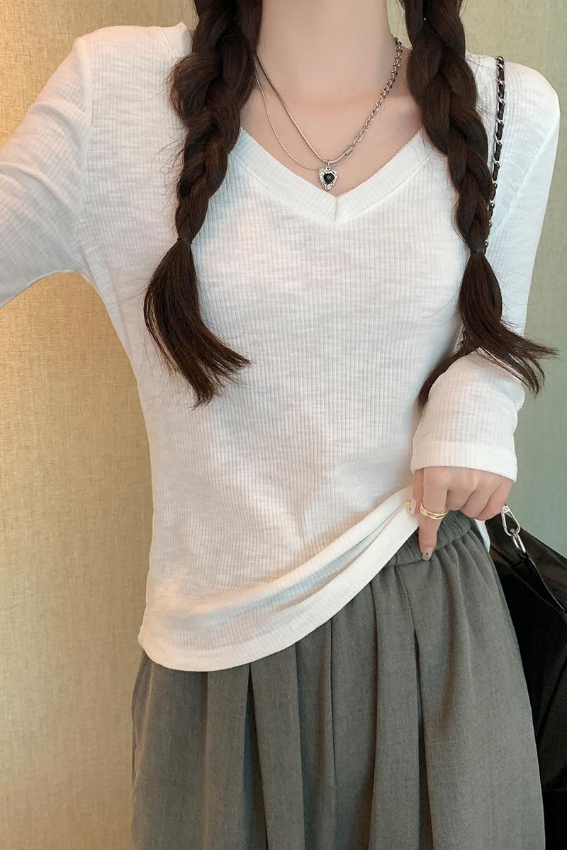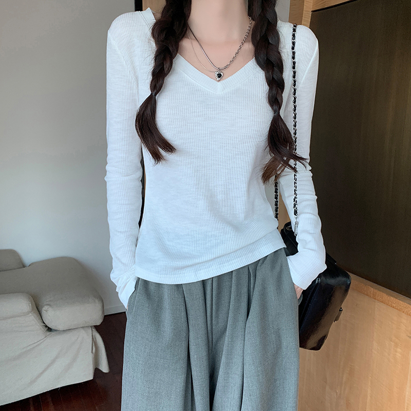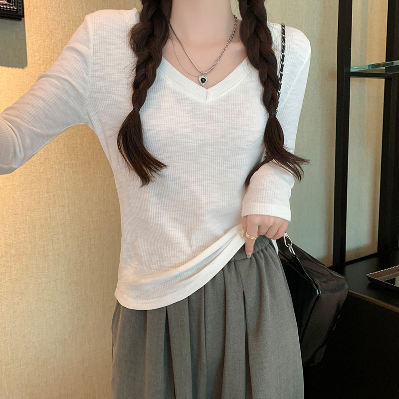 Real-Price Real Shot # 스레드 V- 넥 Long-Sleeved 티셔츠 여성용 가을에 여성을위한 여성용 glim fitbone 노출 탑 슬림 한 내부베이스 셔츠