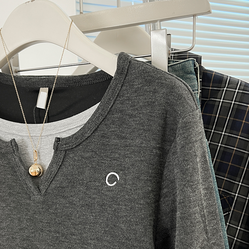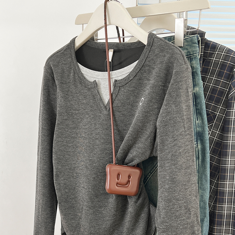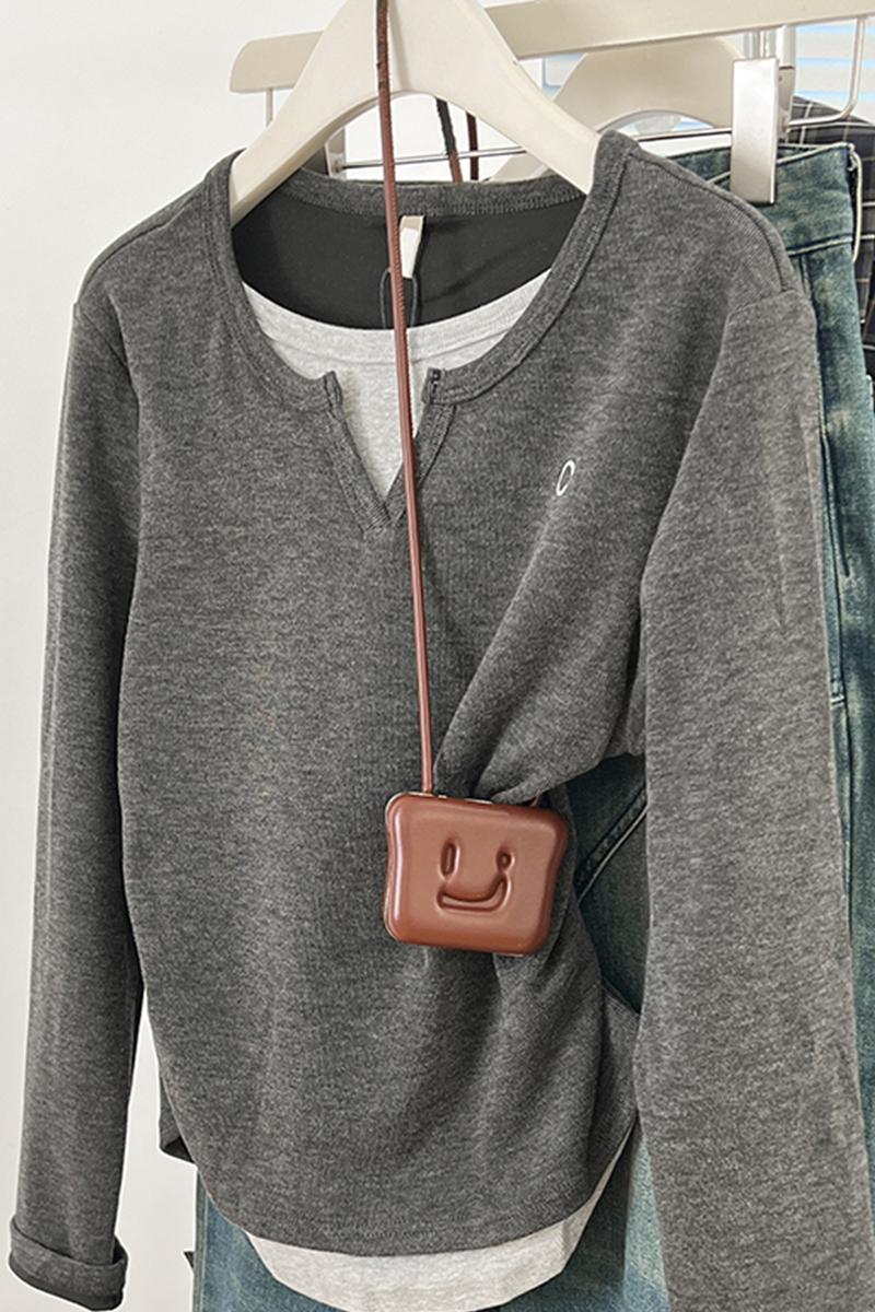 실제 가격 실제 샷 #Grey 가짜 두 피스 전면 어깨 롱 슬레이브 티셔츠 봄과 가을 접힌 허리를 끄는 바닥 셔츠 속옷