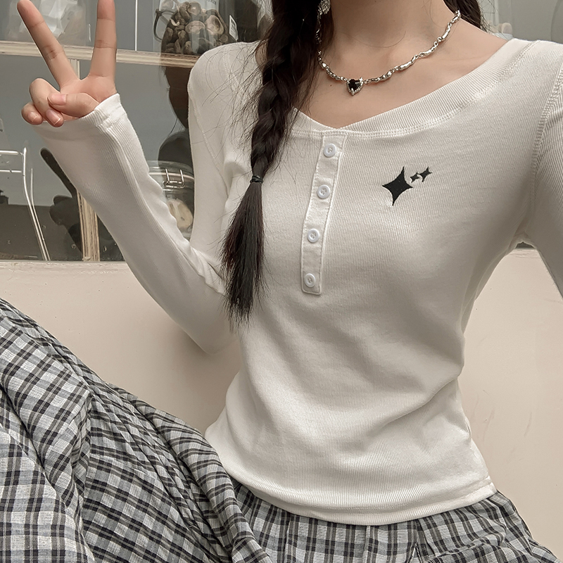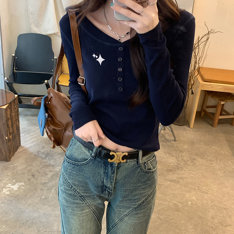 Real-Price Real Shot #봄과 가을 디자인의 여성을위한 미국 스타일의 긴팔 티셔츠 짧은 탑이있는 틈새 틈새 셔츠