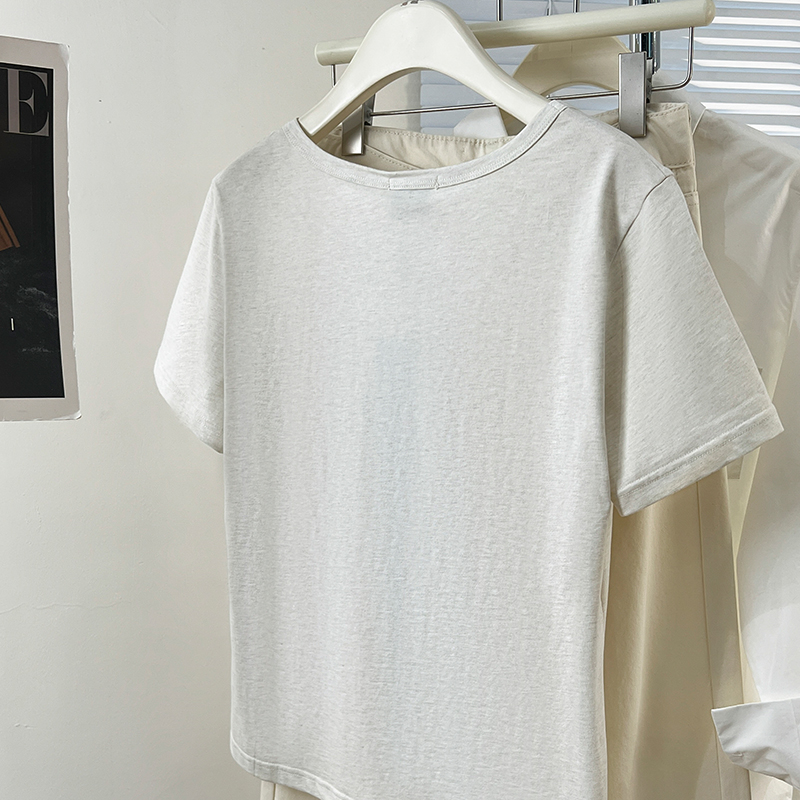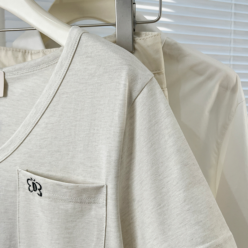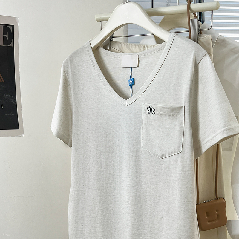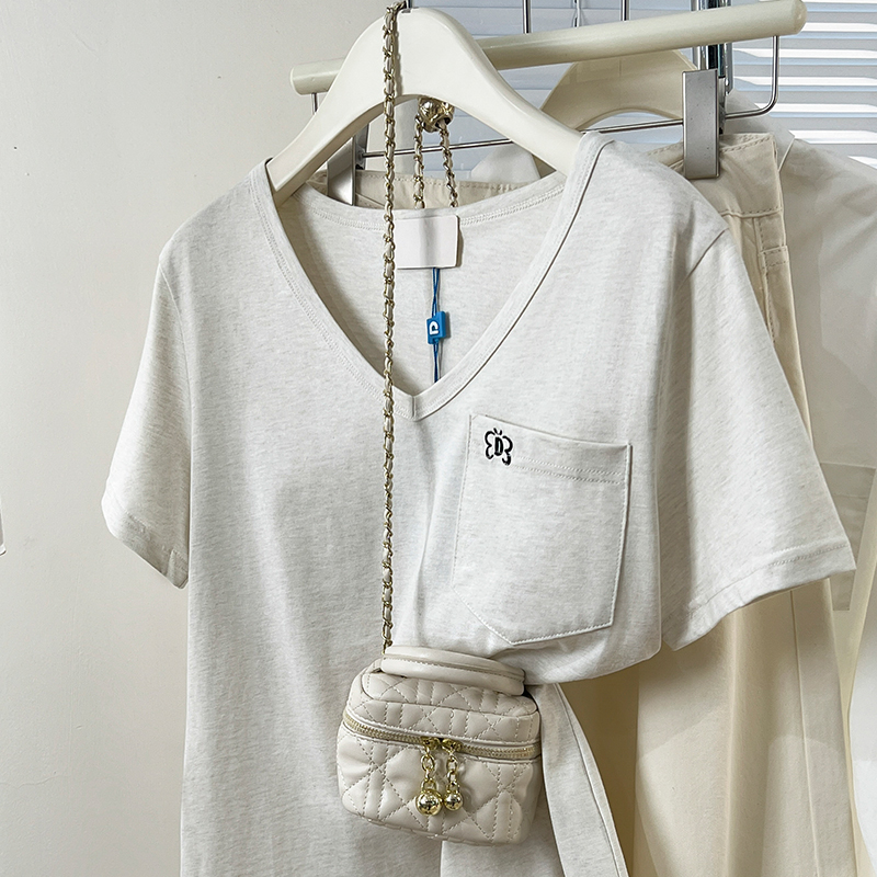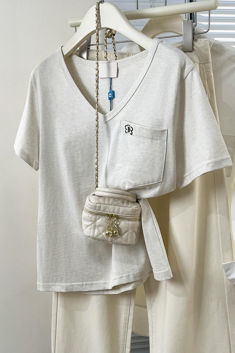 Real Price Real Shot #rice 살구 자수 V- 넥 전면 숄더 어깨 어깨 단락 티셔츠 여름 디자인 틈새 티셔츠 느슨한 탑