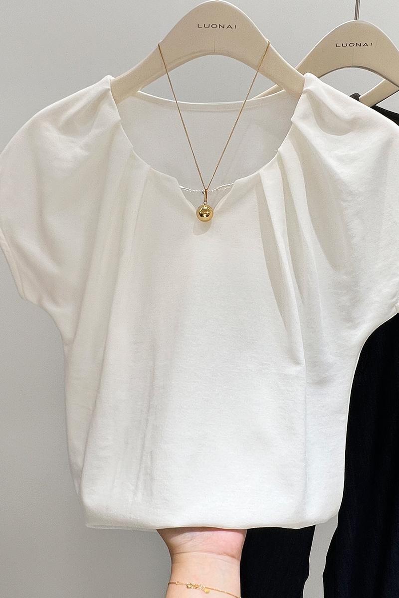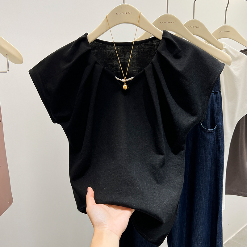 실제 가격 실제 샷 #화이트 주름진 체인 v- 넥 전면 어깨 짧은 슬리브 티셔츠 여름 티셔츠 느슨한 비행 슬리브 탑