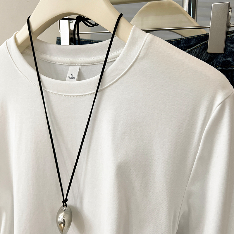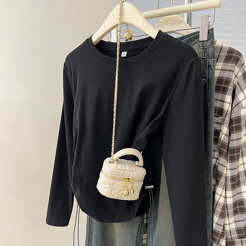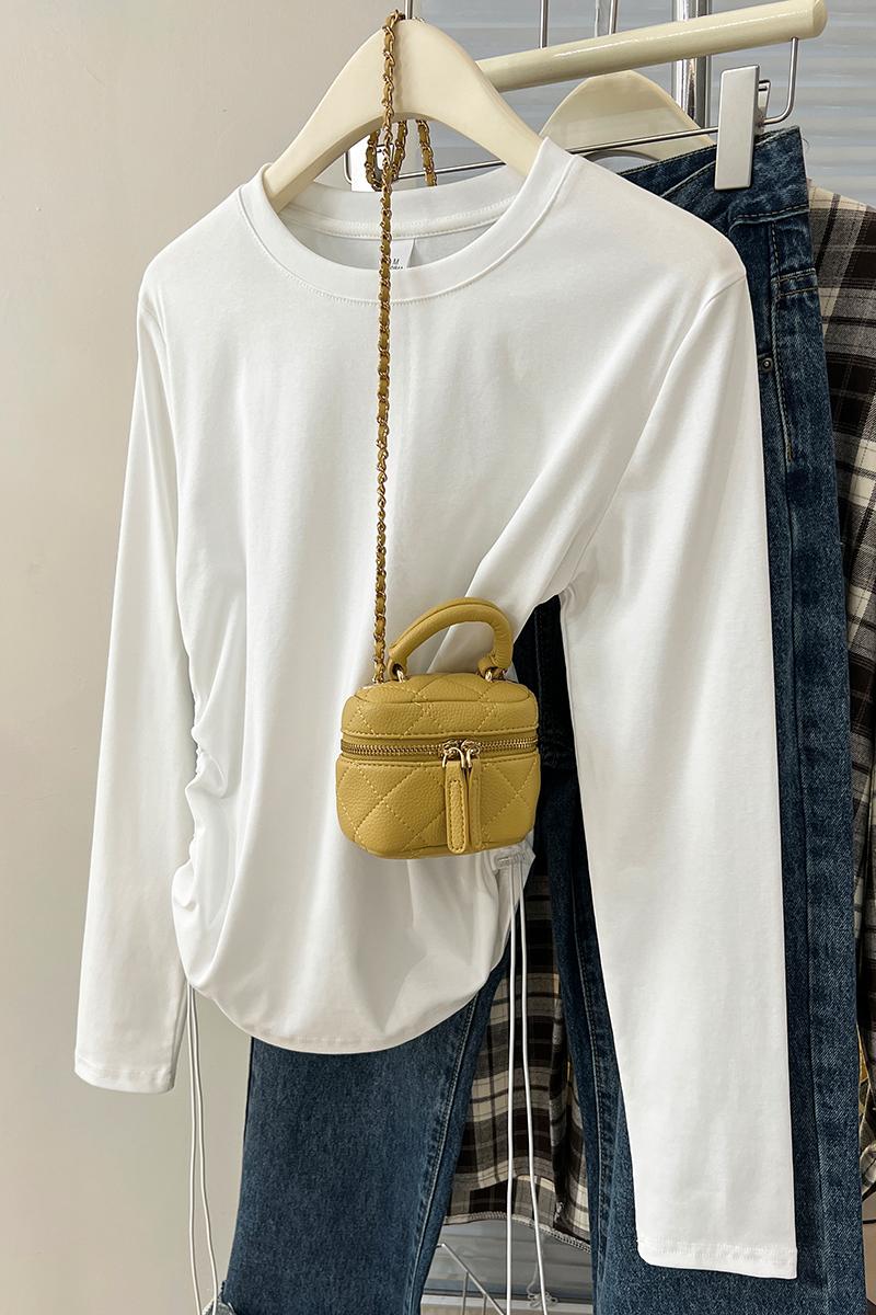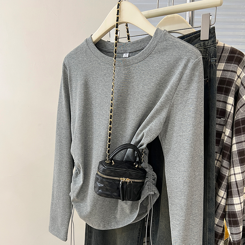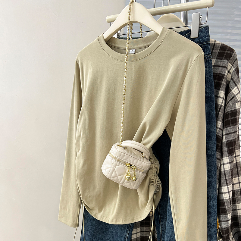 Real-Price Real Shot # Round Neck Slim Long-Sleeved Women 's T-Shirt Autumn New Solid Color Drawstring Design Top Chic베이스 셔츠