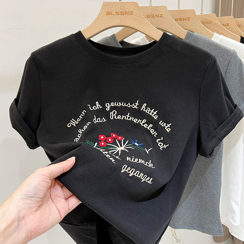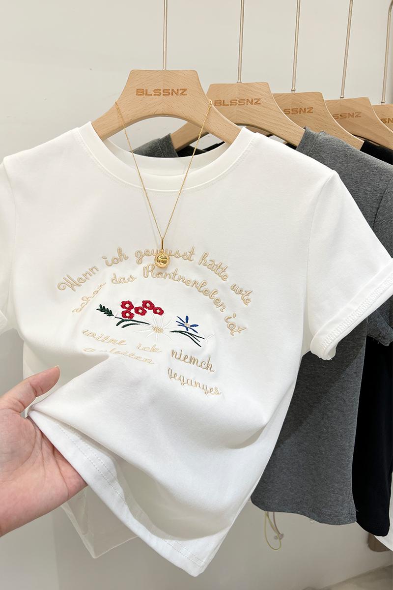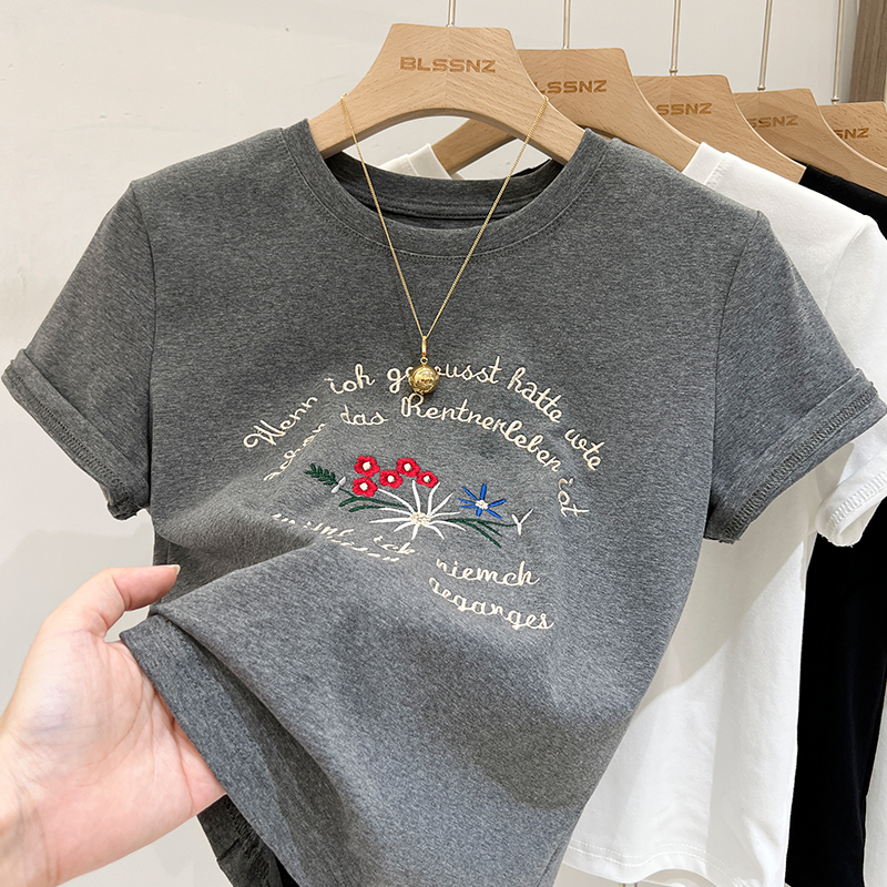Real-Price Real Shot #Grey Letter Flower 자수 순수면 어깨 짧은 슬림 한 여름에 여성을위한 여름 Slim Short Top