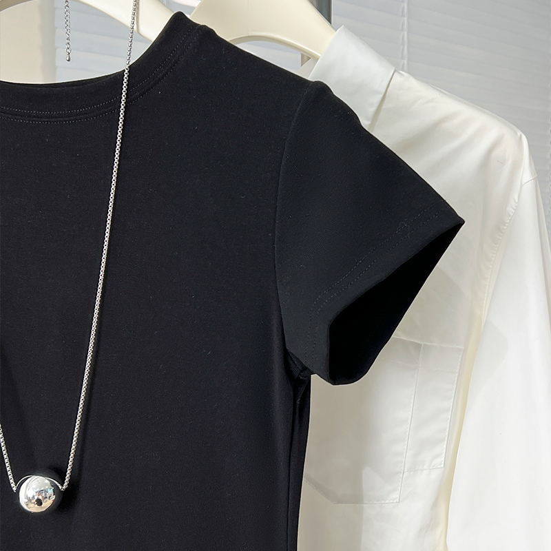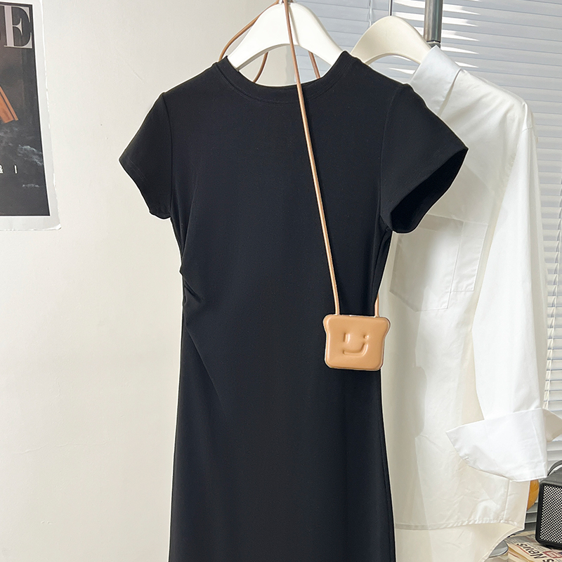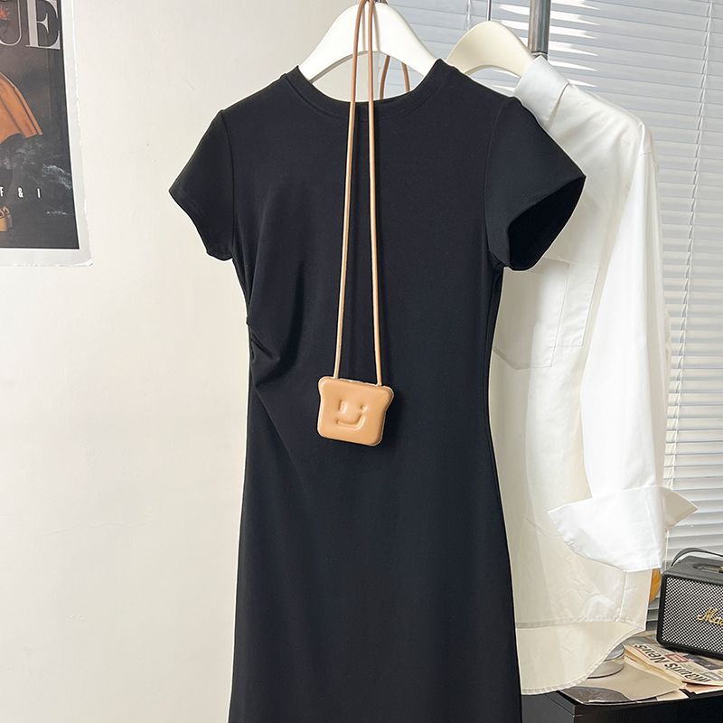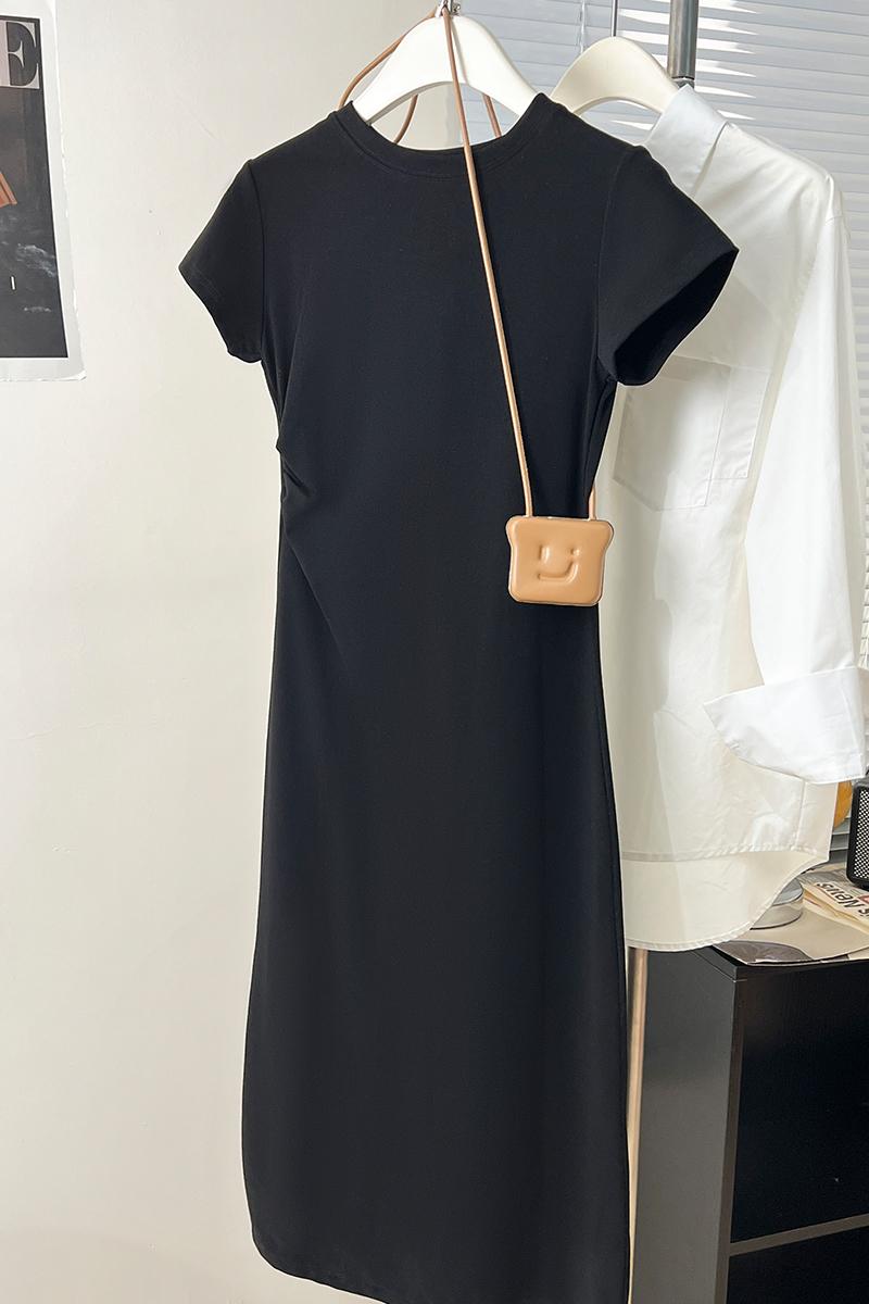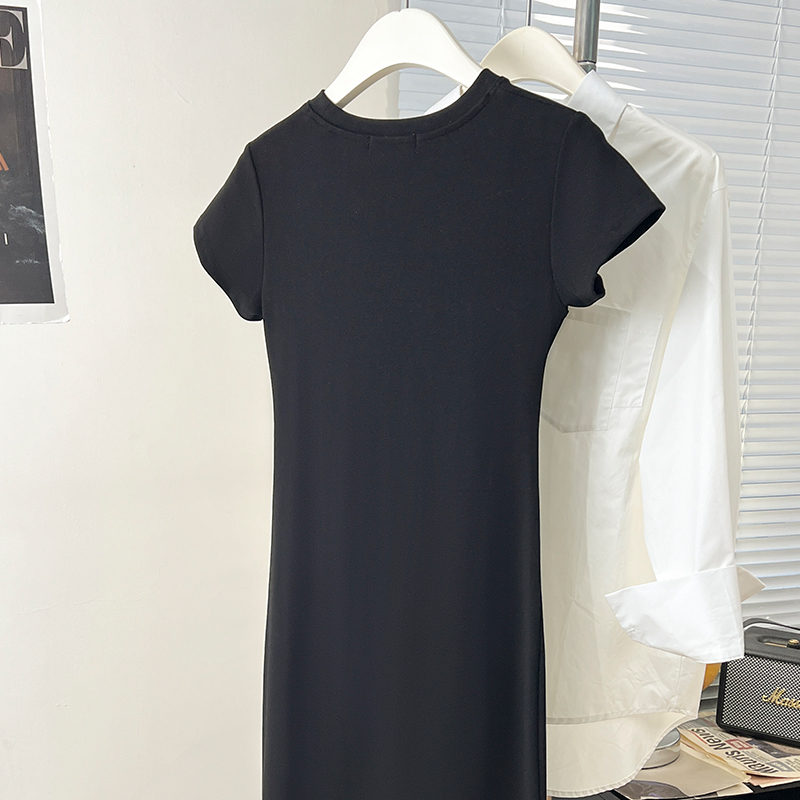 실제 가격 실제 샷 #블랙 짧은 슬릿 티셔츠 드레스 여름, 고급 및 우아한 허리 껴안는 긴 스커트