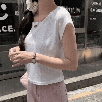스퀘어넥과 레이스 디테일이 돋보이는 크롭 반팔 티셔츠. 여름에 여성스러운 포인트 아이템으로 활용하기 좋아요.