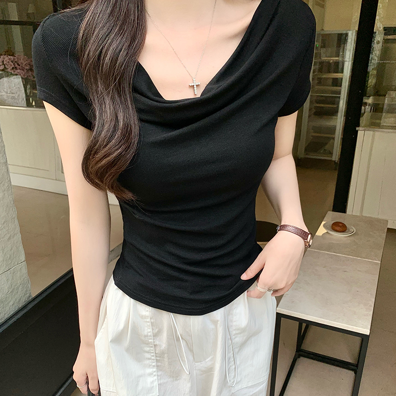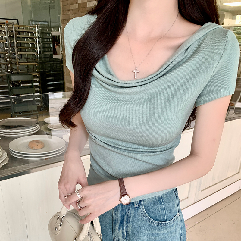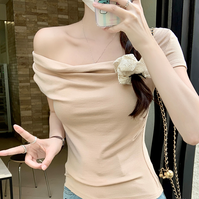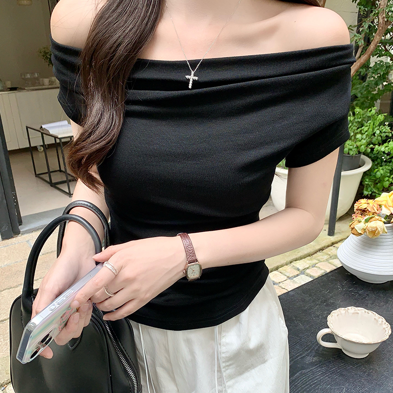 진짜 가격 모달 스윙 네크 라인 스트레이트 어깨 어깨 단축 티셔츠 여름에 여성을위한 새로운 짧은 불규칙한 탑