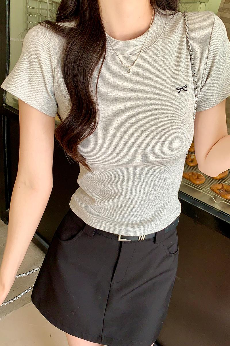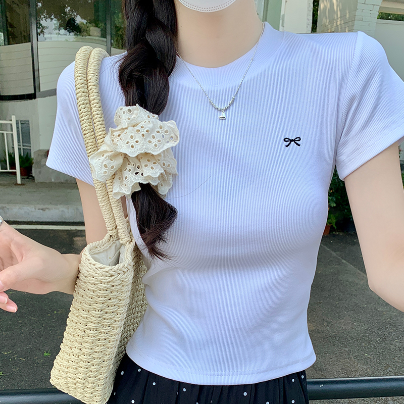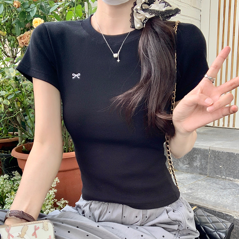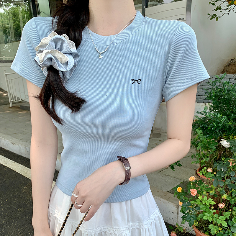 Blue Bow 자수 여름에 여성을위한 짧은팔 티셔츠 여름 짧은 디자인 Top New