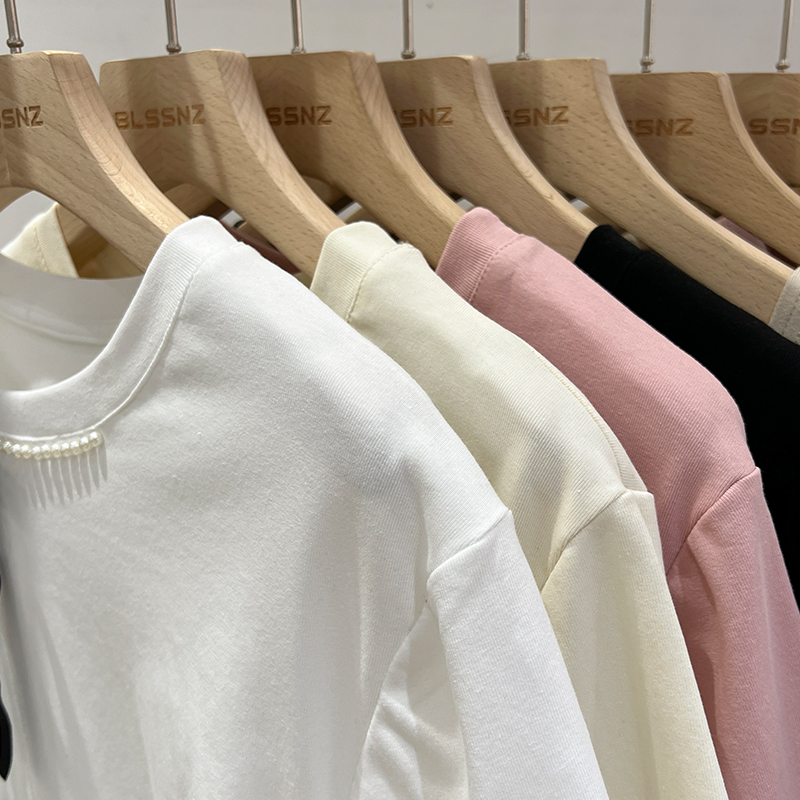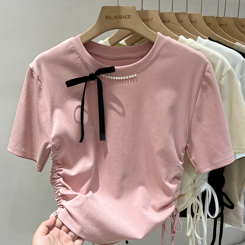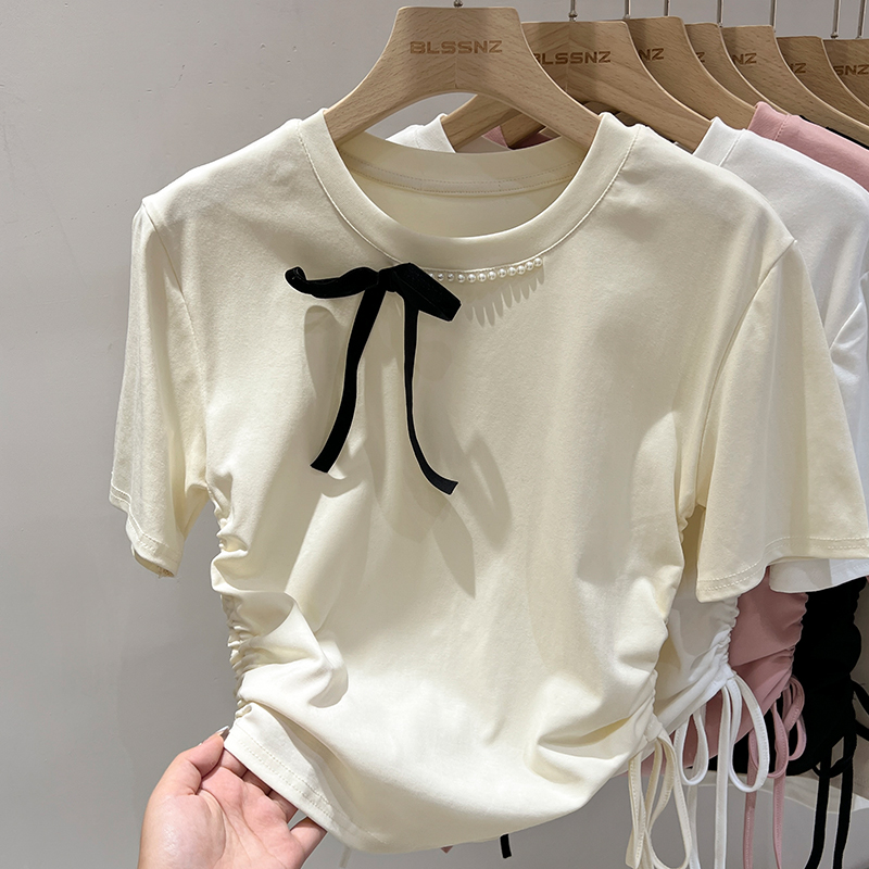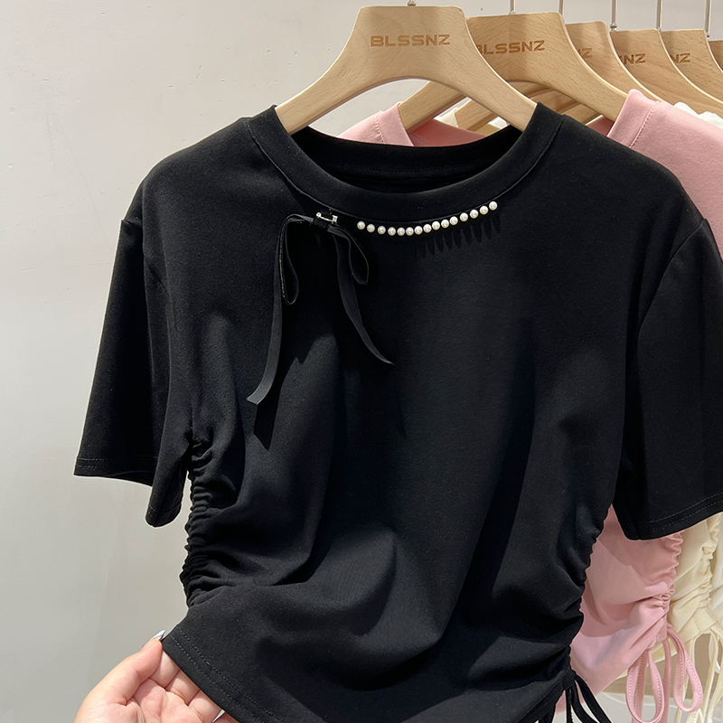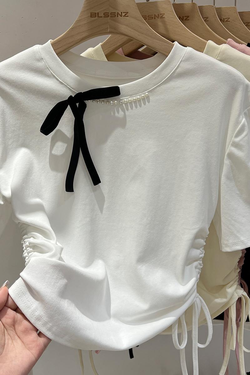 진짜 가격 실제 샷 #화이트 드로우 스트링 불규칙 어깨 짧은 슬리브 티셔츠 여름 구슬 구슬 바비 짧은 상단