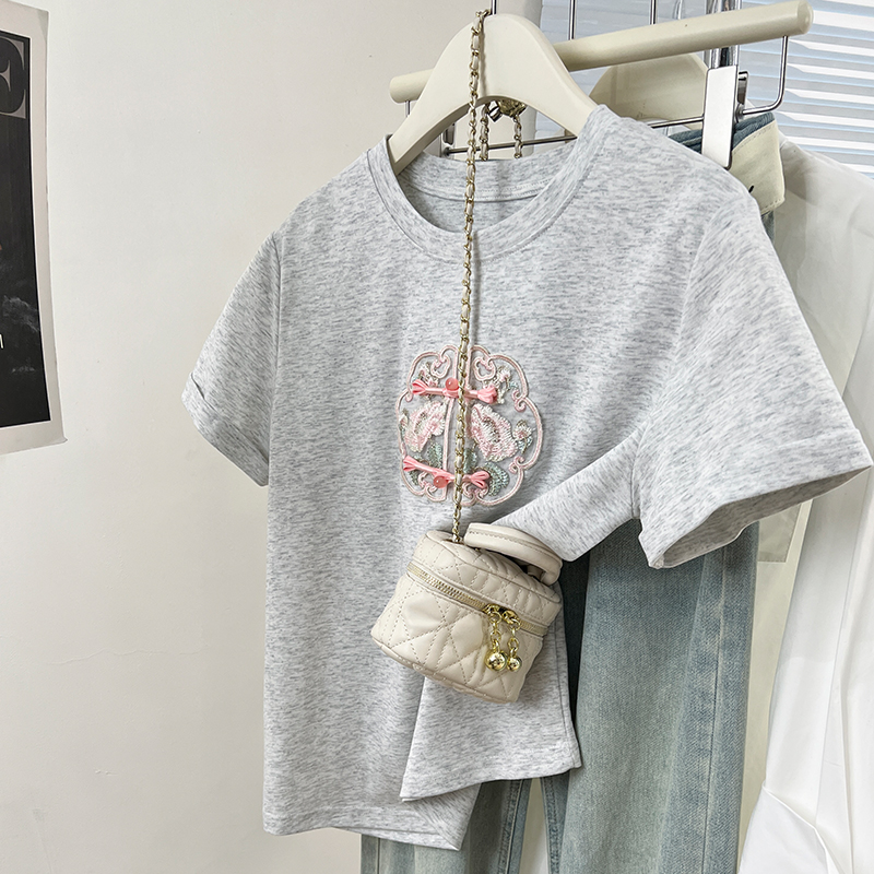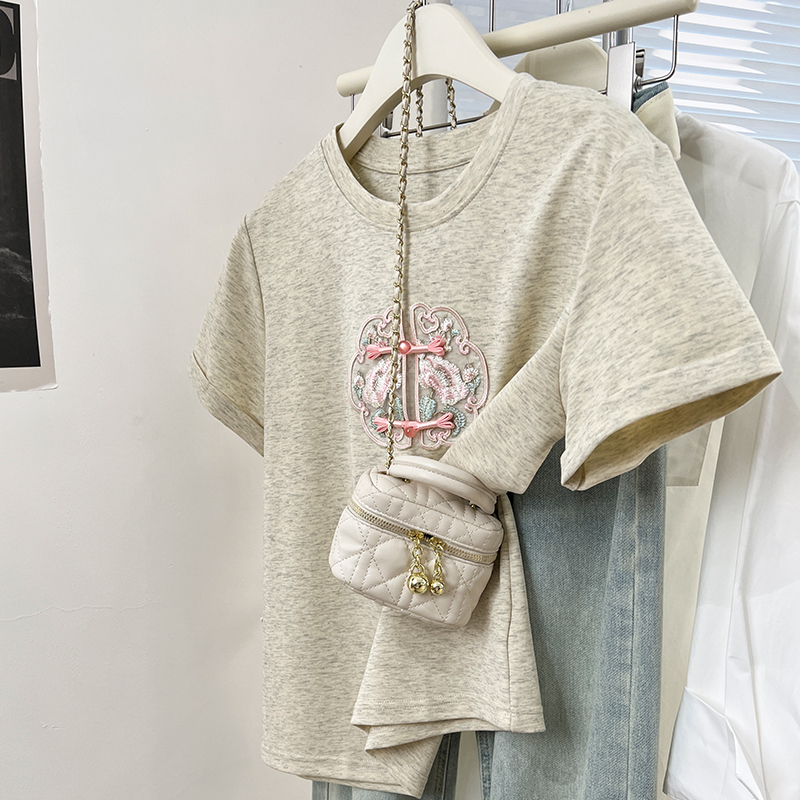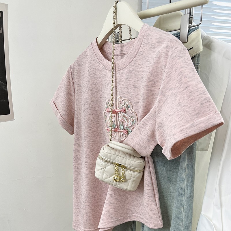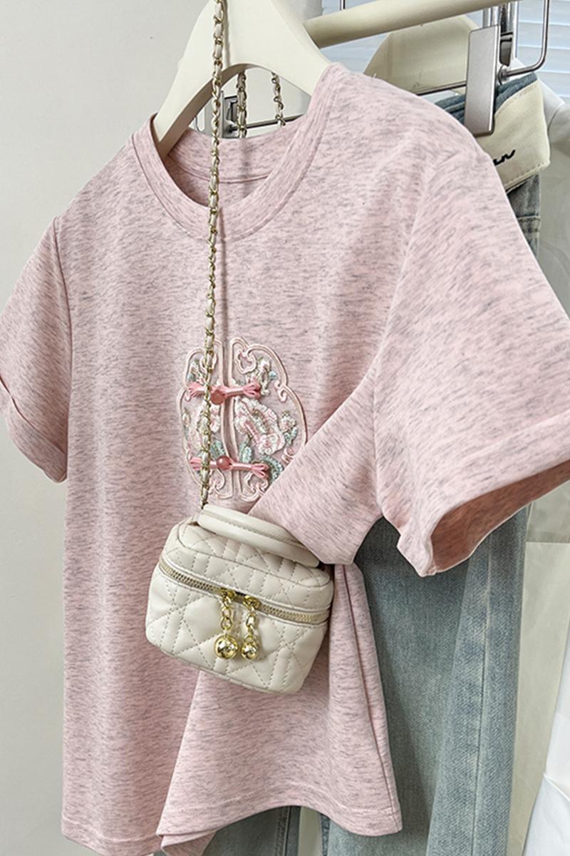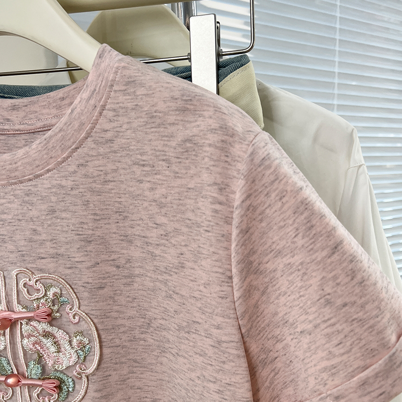 실제 가격 실제 샷 #NEW 중국 스타일 자수 핑크 순수면 앞쪽 앞쪽 어깨 짧은 슬리프 티셔츠 여름 여름 티셔츠 탑