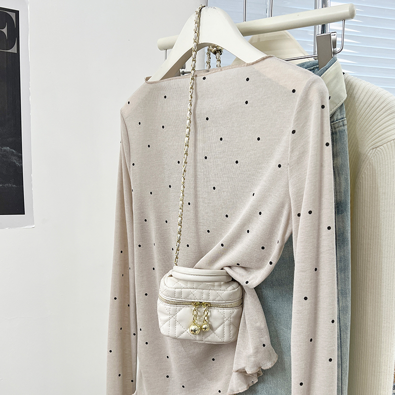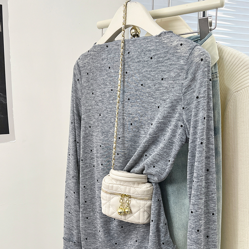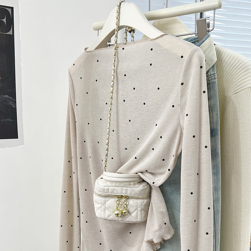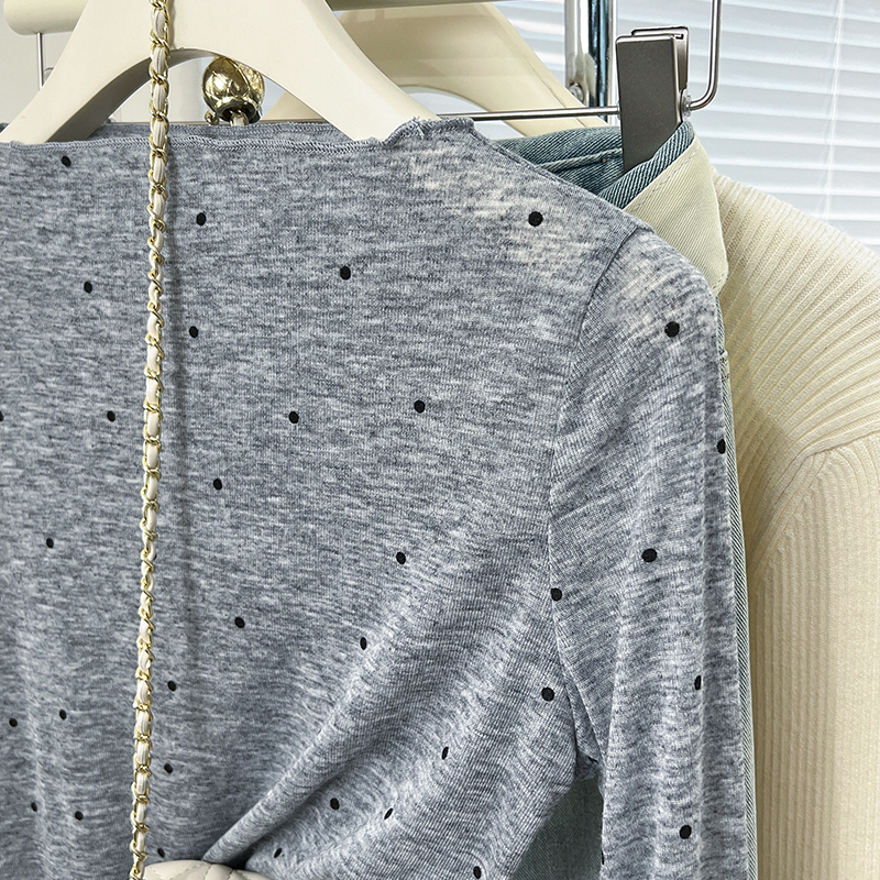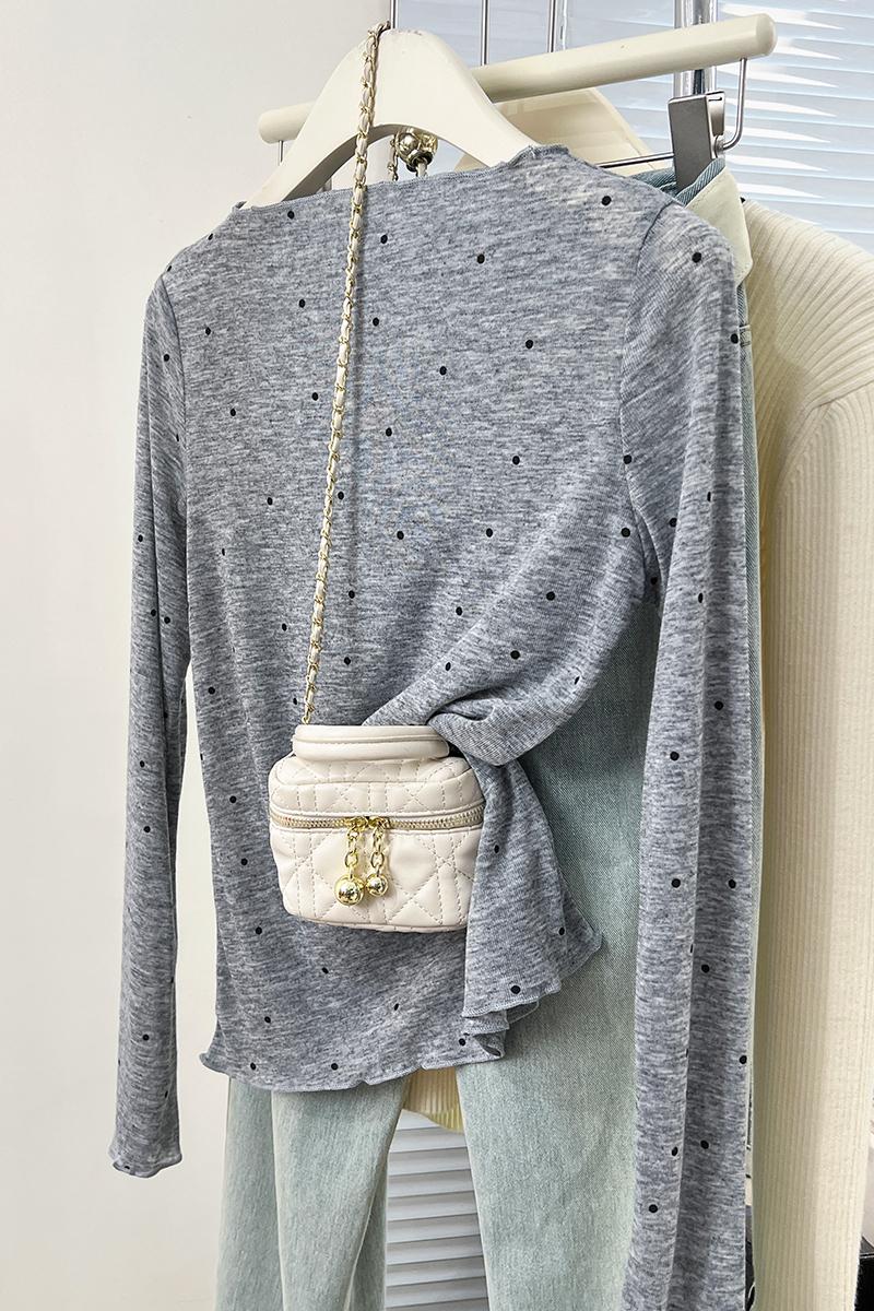 Real-Price Real Shot #Gray Polka DOT 여성용 얇은 봄과 가을 탑 층 바닥 셔츠를위한 긴팔 장거리 티셔츠