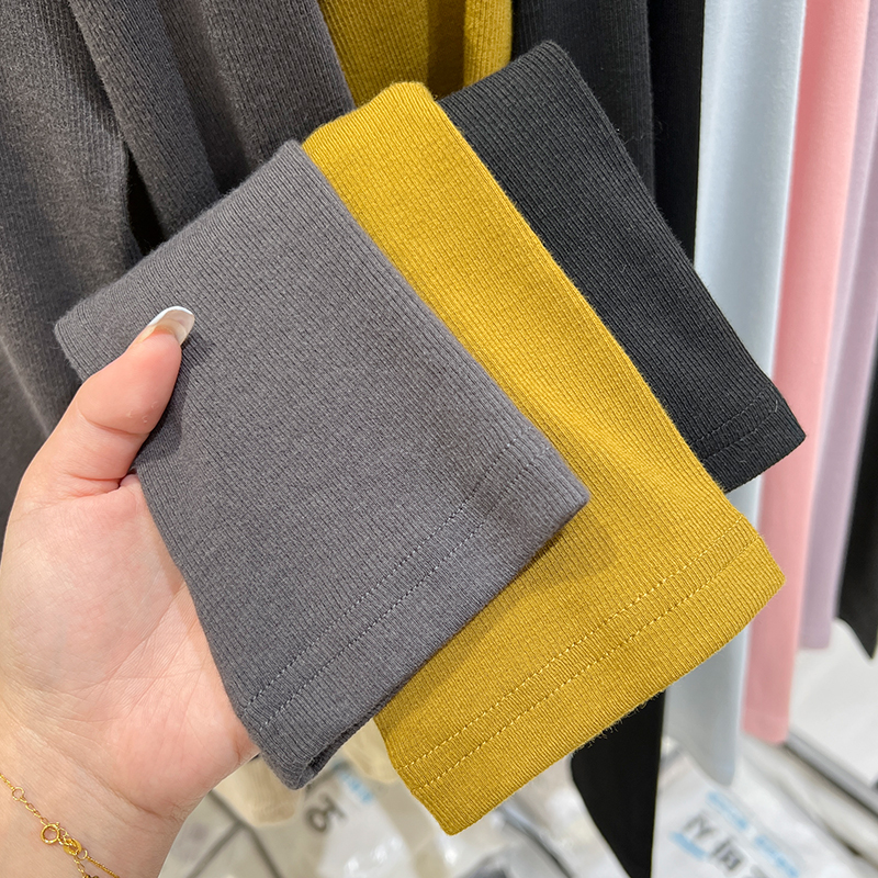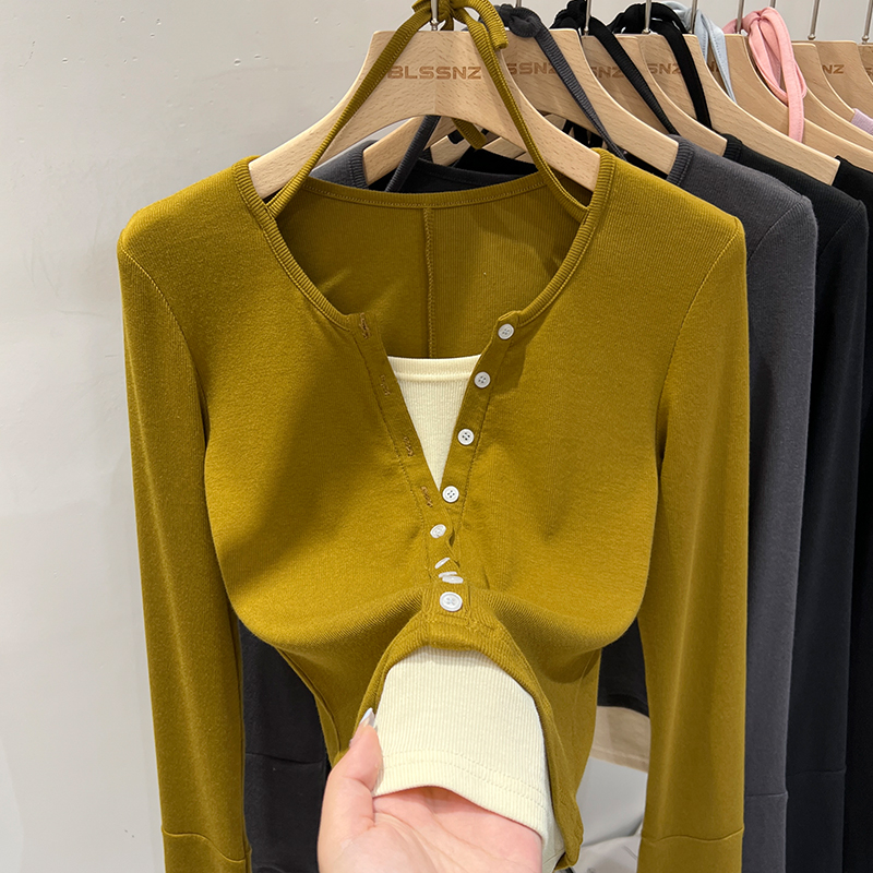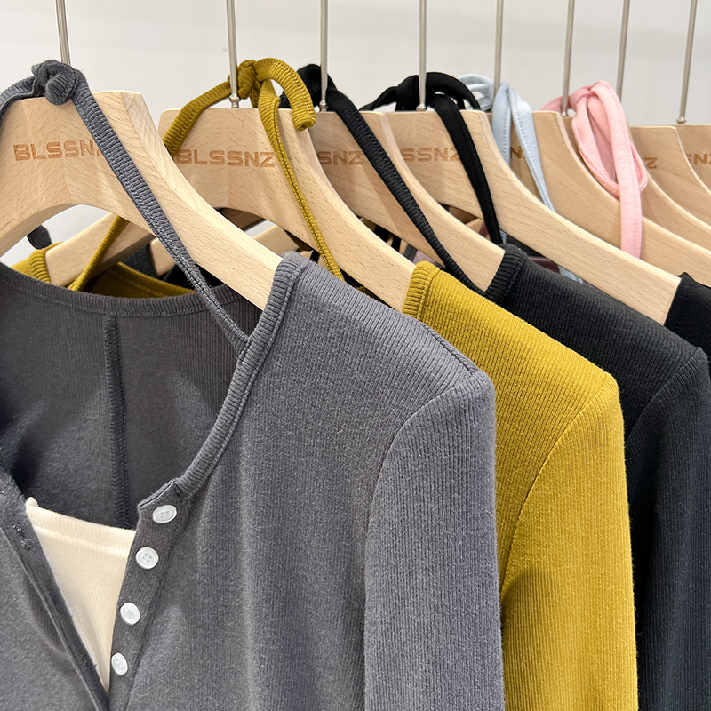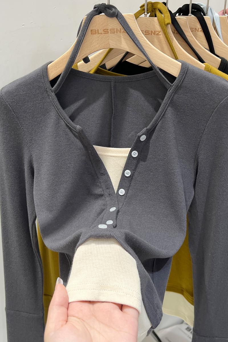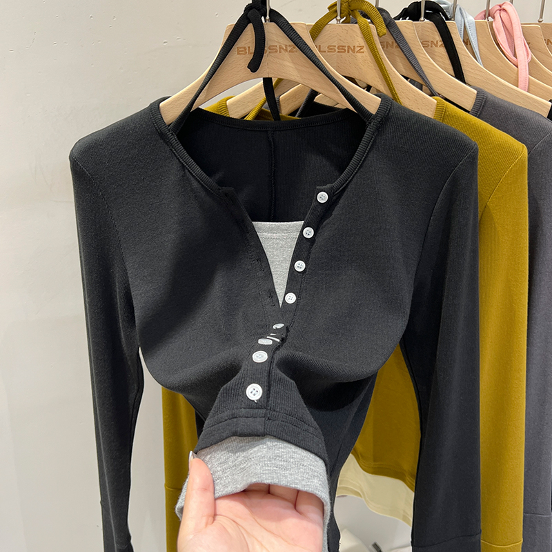 Real-Price Real Shot #American Retro Grey 가짜 두 피스 앞쪽 어깨 긴팔 티셔츠 여자 봄과 가을베이스 셔츠 짧은 탑