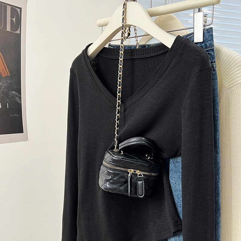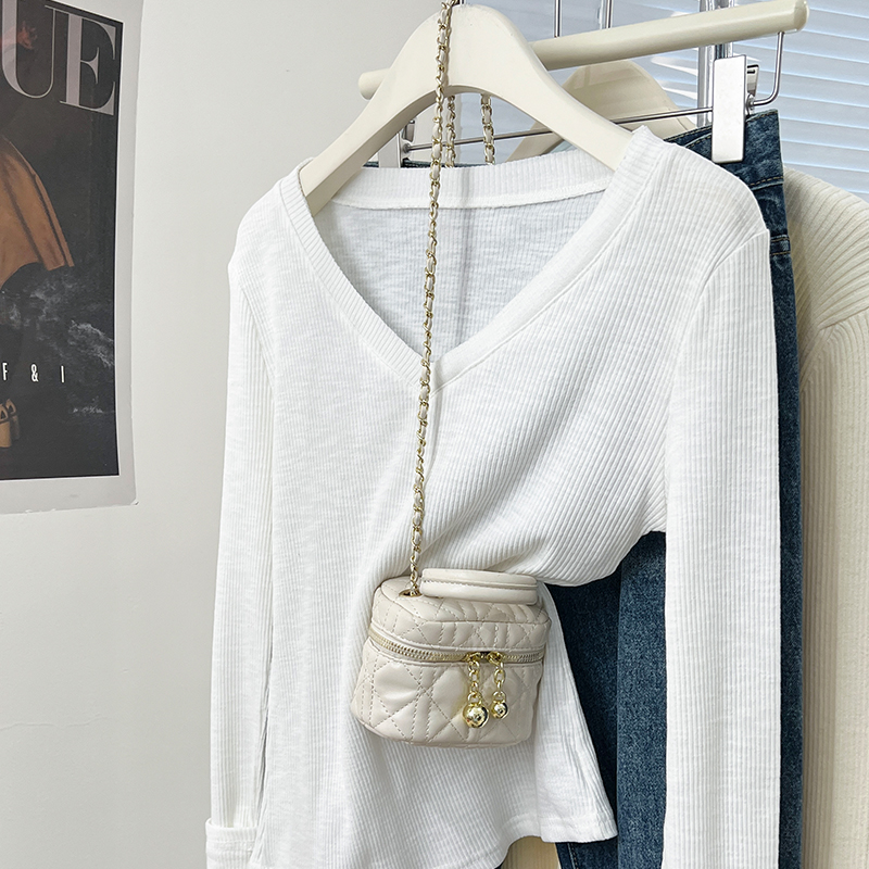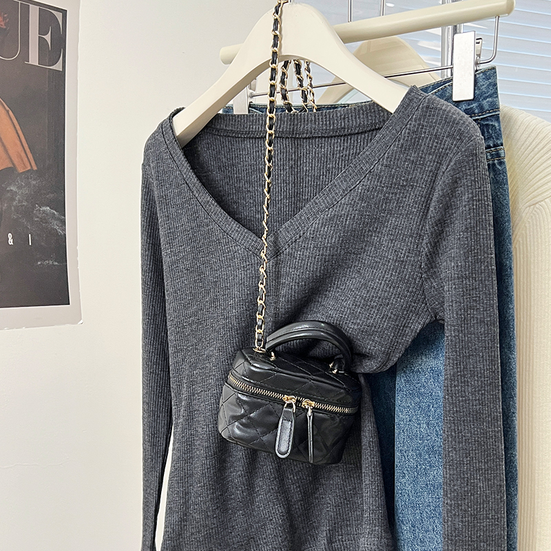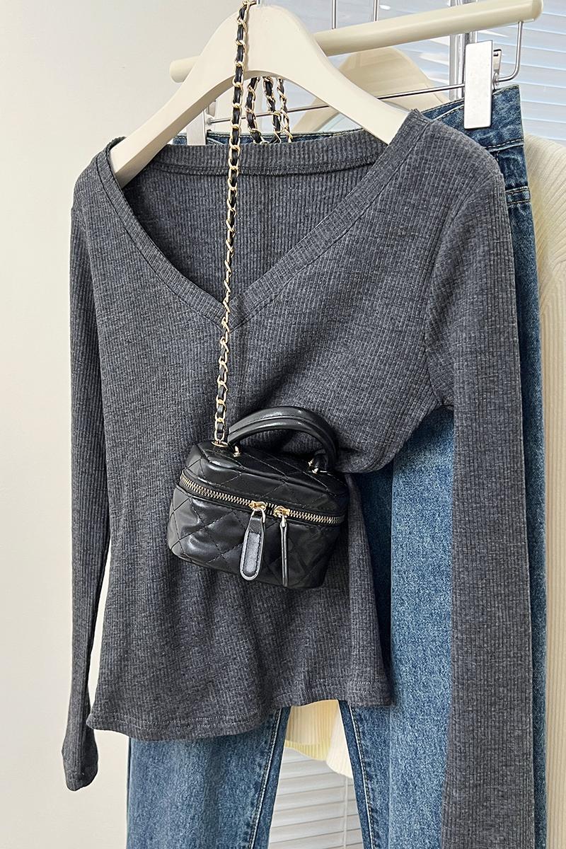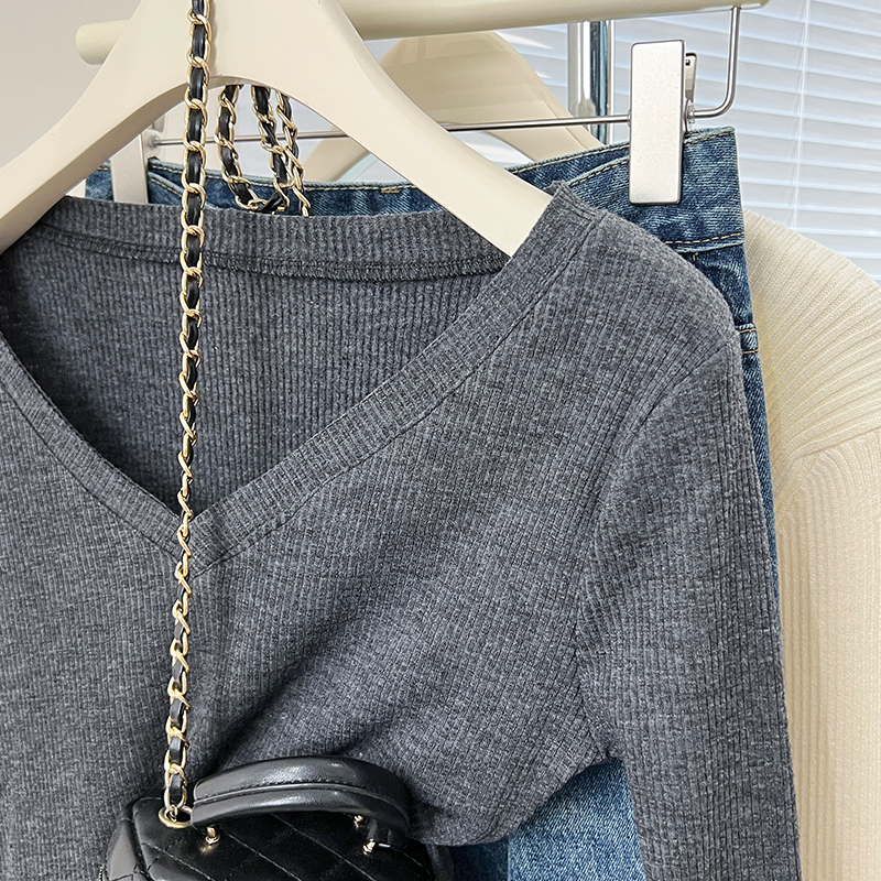 Real-Price Real Shot # 나사산 회색 모피 코팅 어깨 v- 넥 긴팔 티셔츠 여성 스프링 슬림베이스 셔츠 속옷